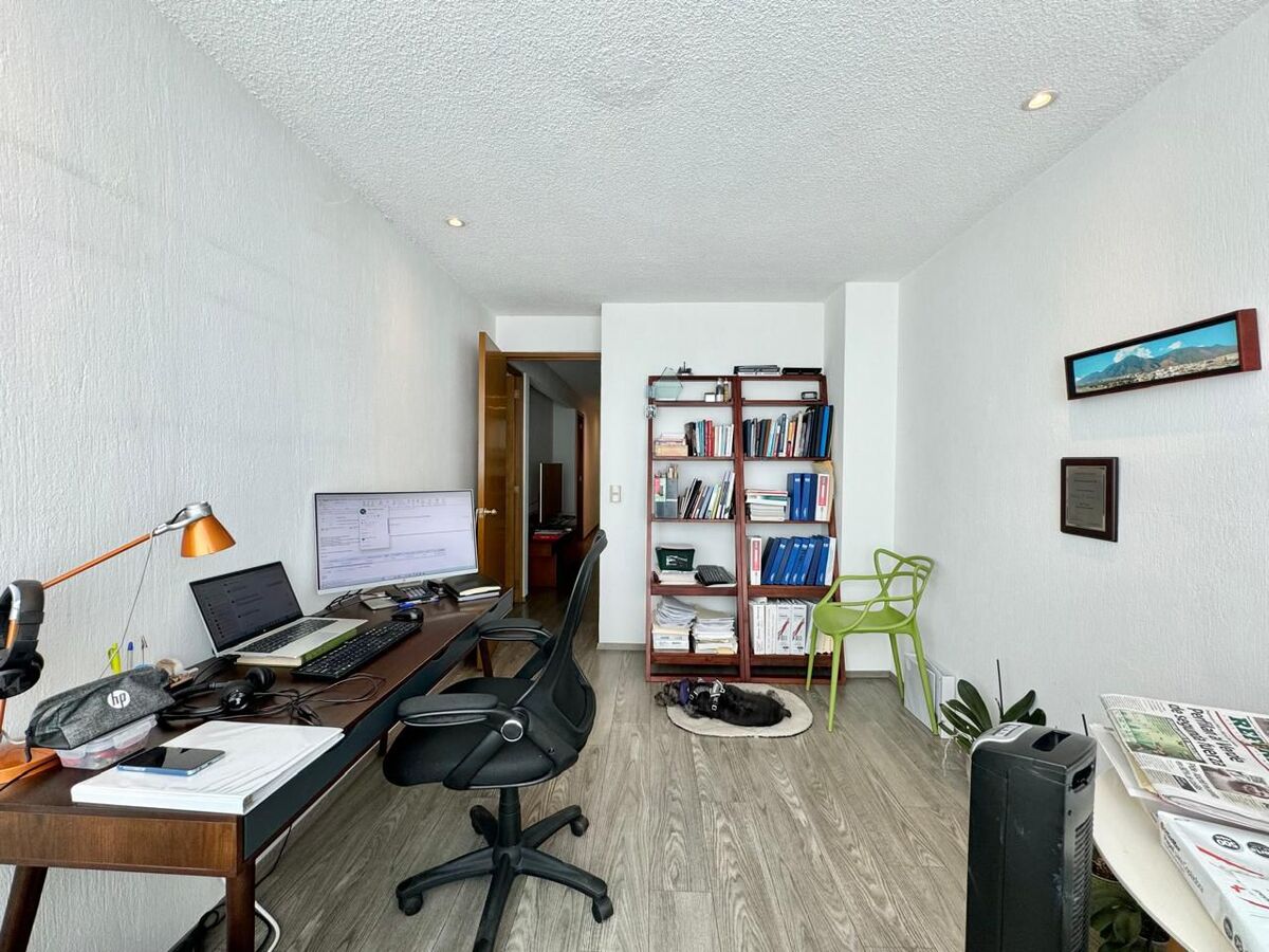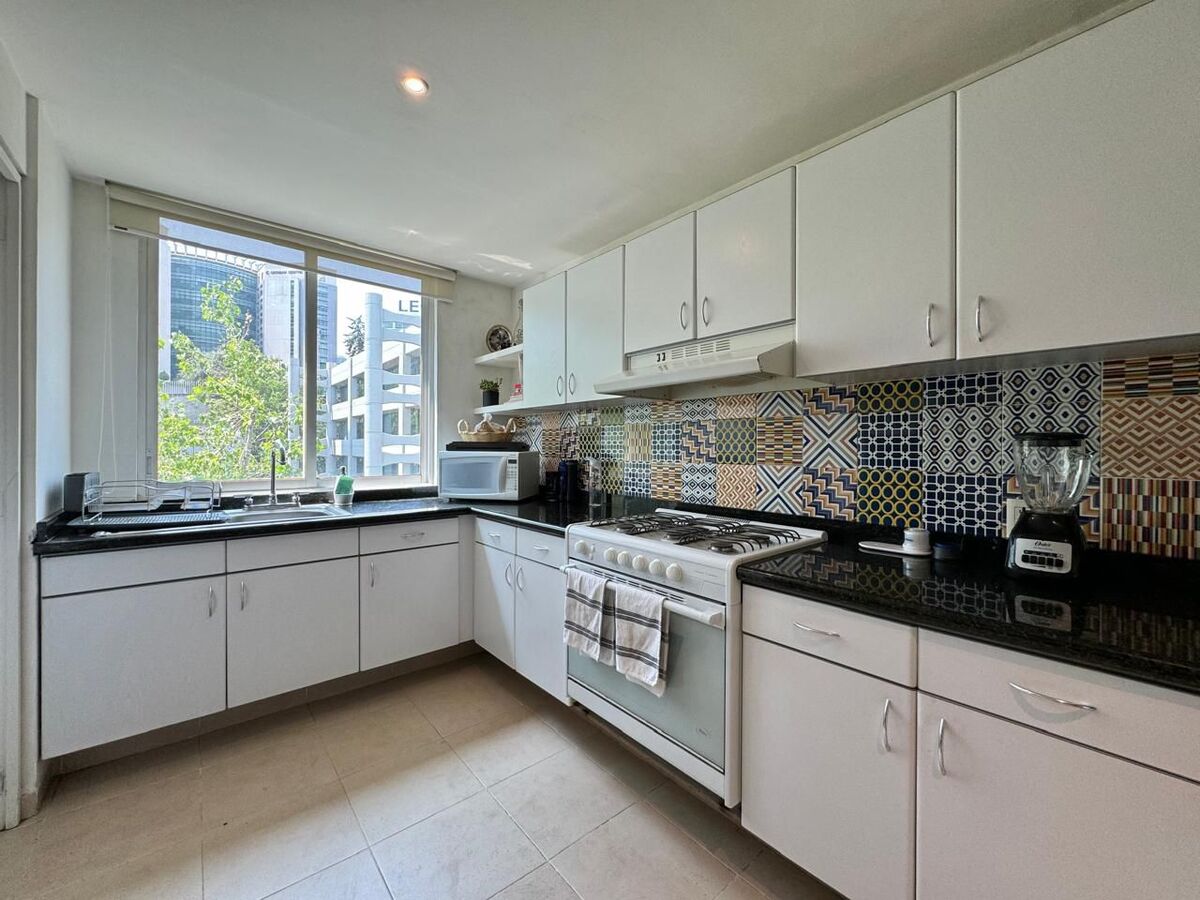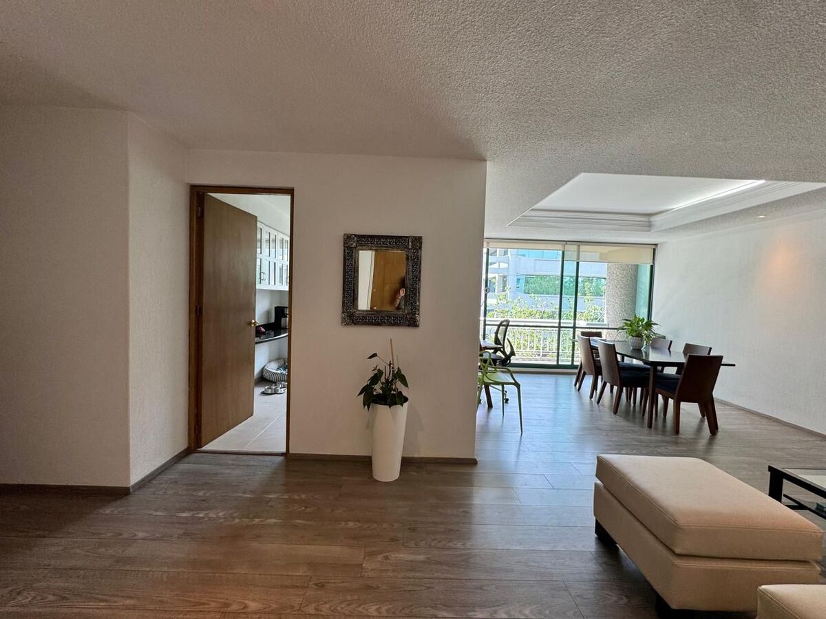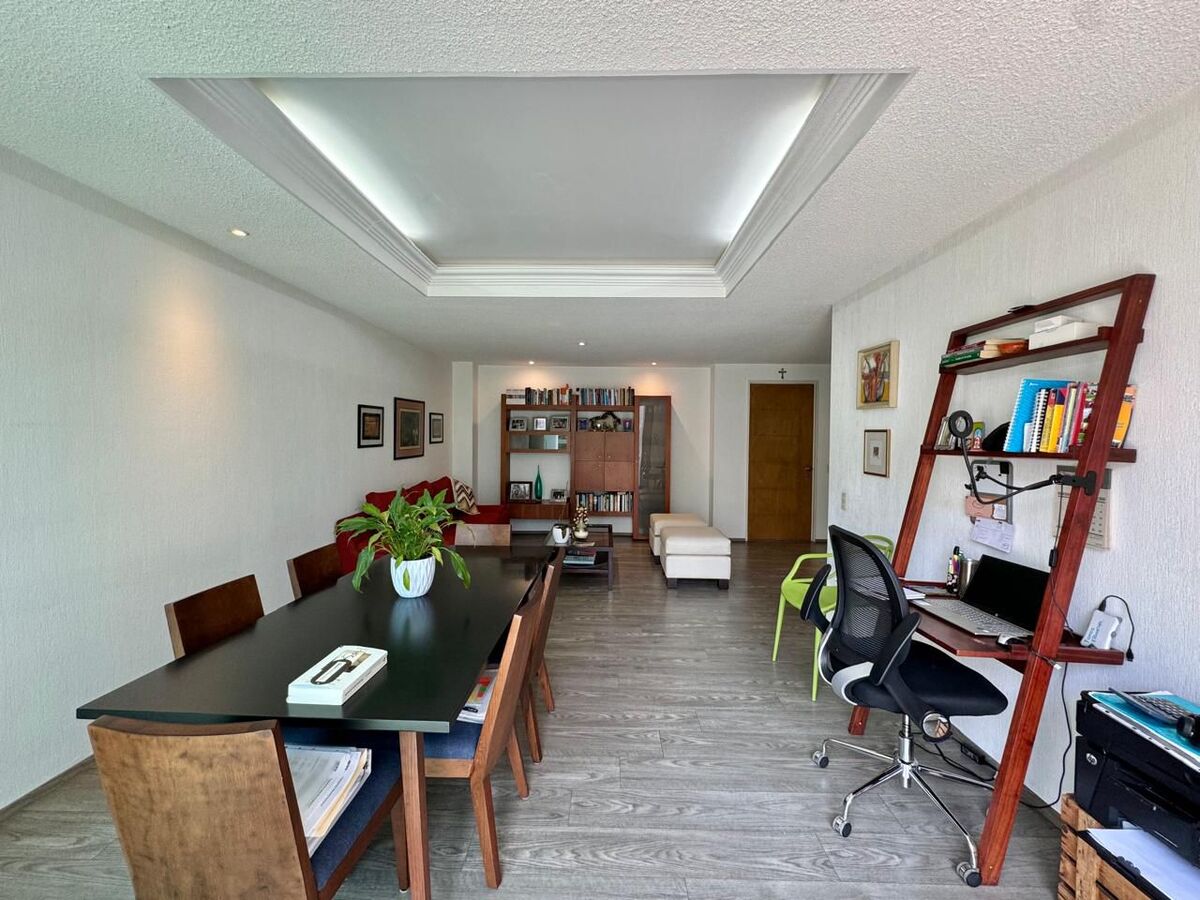 Departamento en el corazón Santa Fe. La distribución del departamento en 141 m2 consta de; sala con amplios espacios, comedor, balcón desde donde tienes una excelente vista, cocina cerrada, un family y 3 recamaras la principal con baño y vestidor, las 2 recamaras secundarias comparten baño completo con el área social. Cuenta con cuarto de lavado, cuarto de servicio y 2 lugares de estacionamiento.