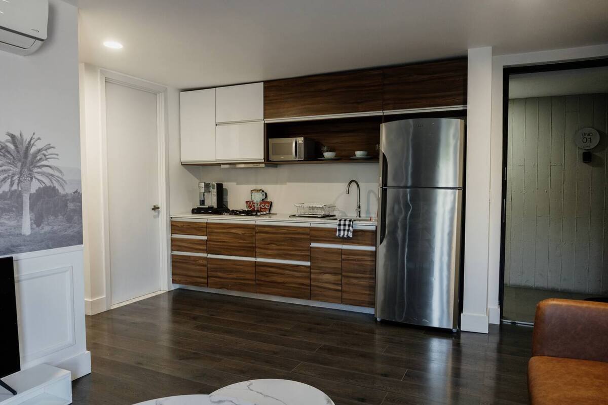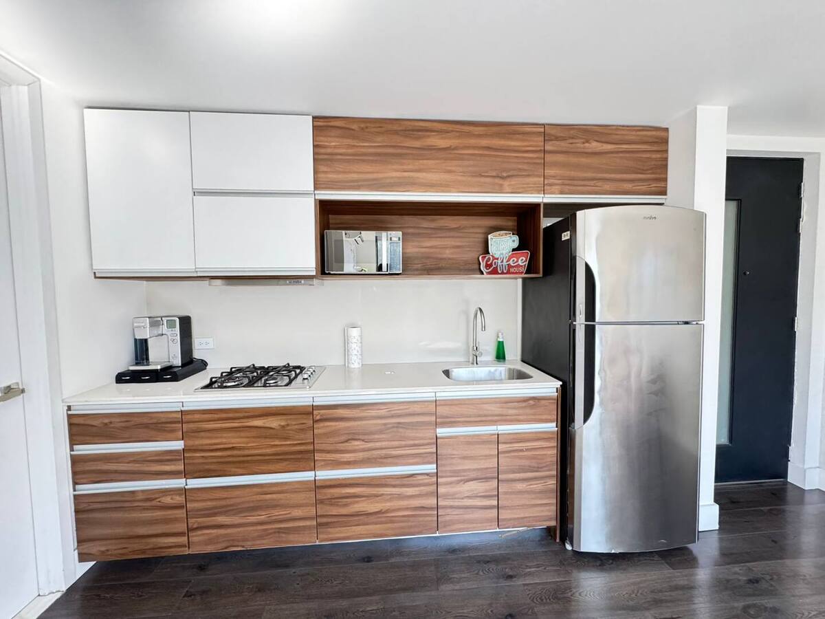 Cocina integral con estufa, campana, microondas, refrigerador y barra