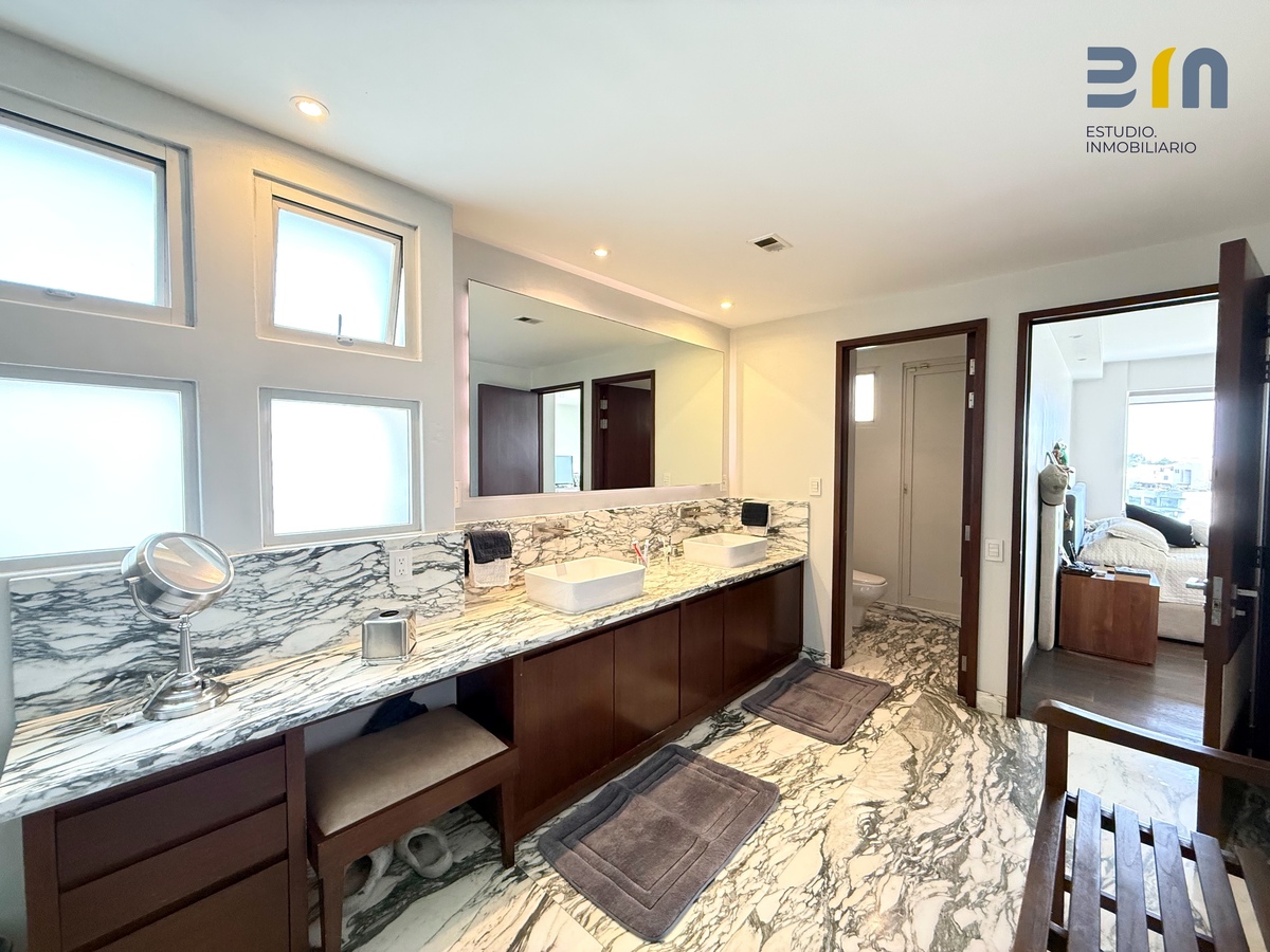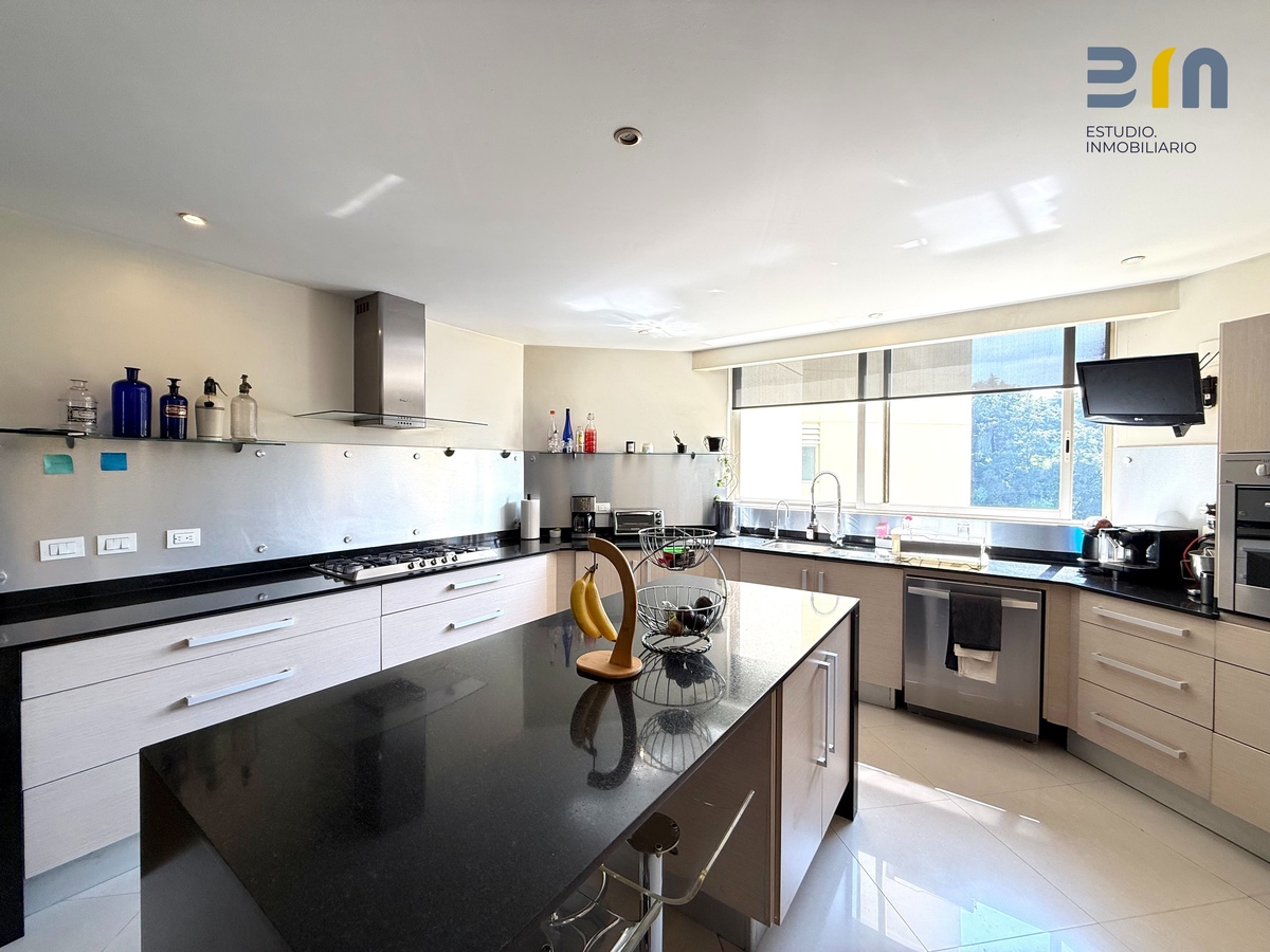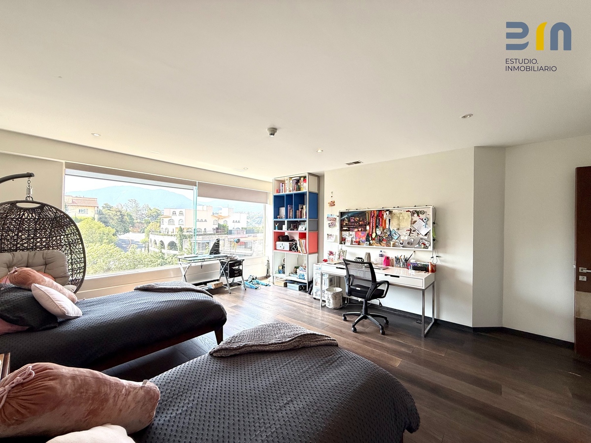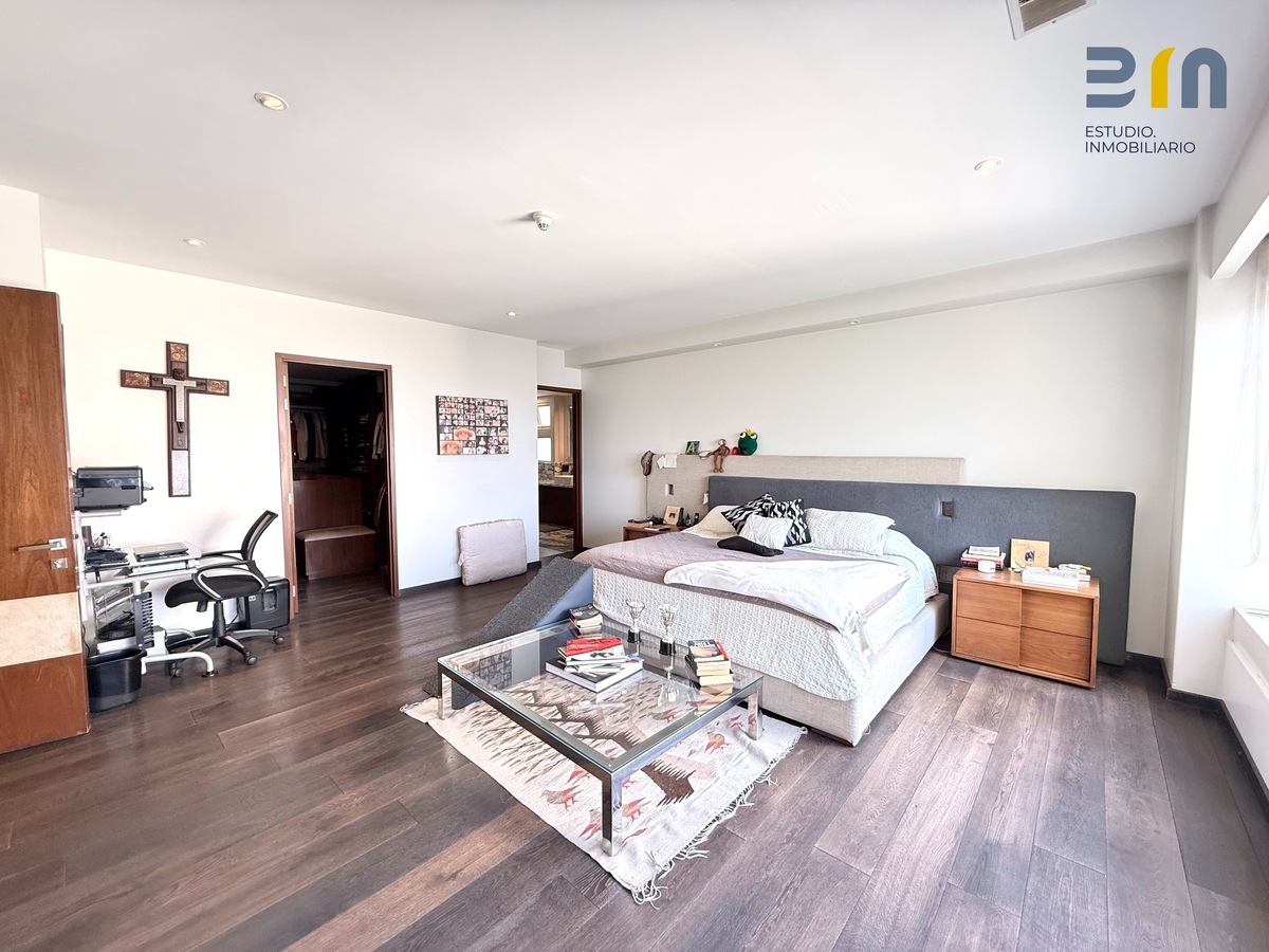 La zona privada ofrece tres recámaras, cada una con baño y vestidor, un estudio u oficina con acceso a la terraza, cocina integral con área de lavandería, dos cuartos de servicio, bodega y tres lugares de estacionamiento.