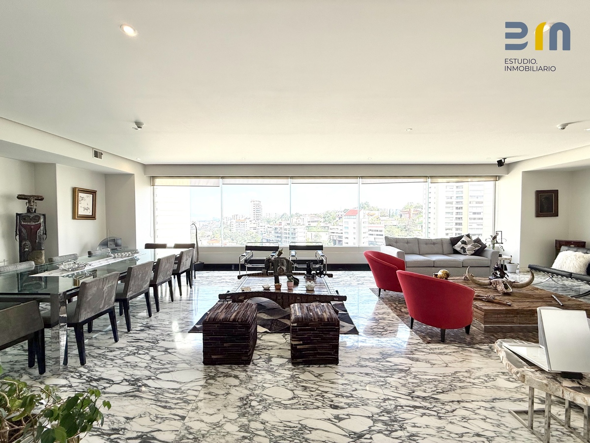 Ubicado en la Torre F, el departamento goza de una hermosa vista verde desde todas sus áreas. Con 425 m² habitables y terraza, este hogar se distingue por su diseño, amplitud y acabados de lujo.