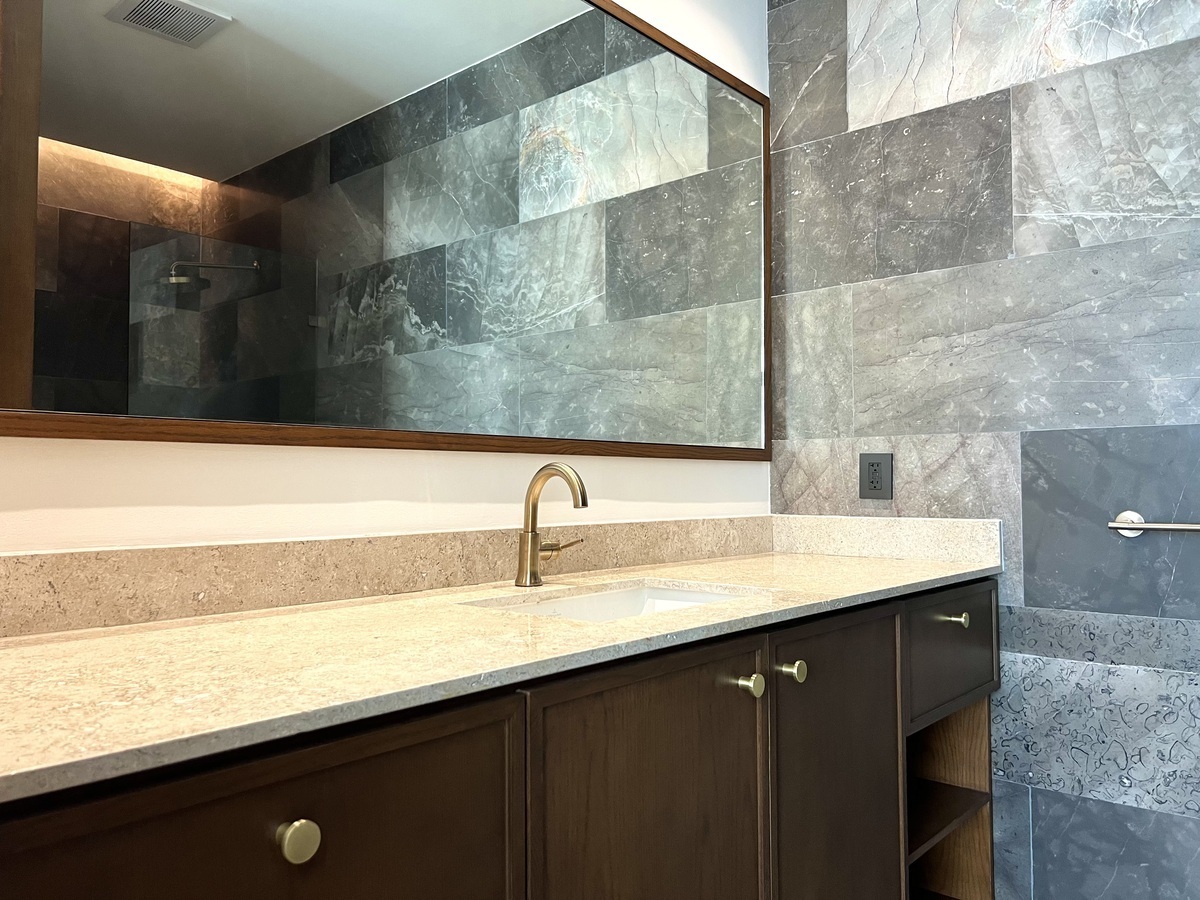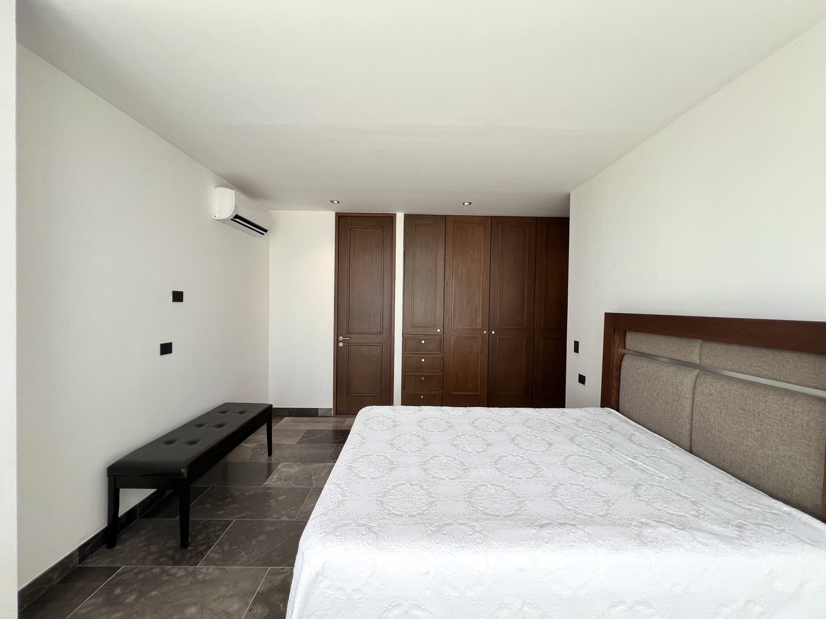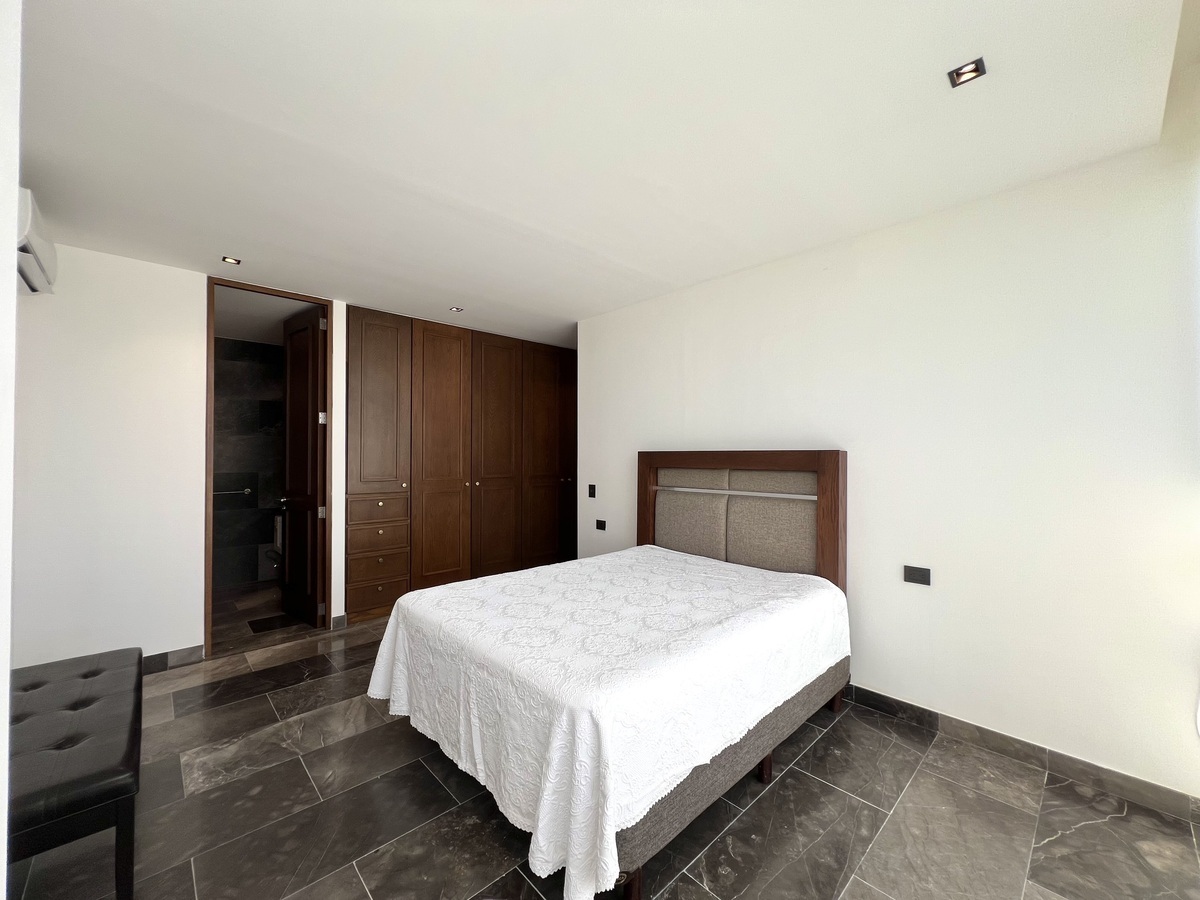 Recámara principal con cama Queen Size, clóset vestidor equipado y baño completo.