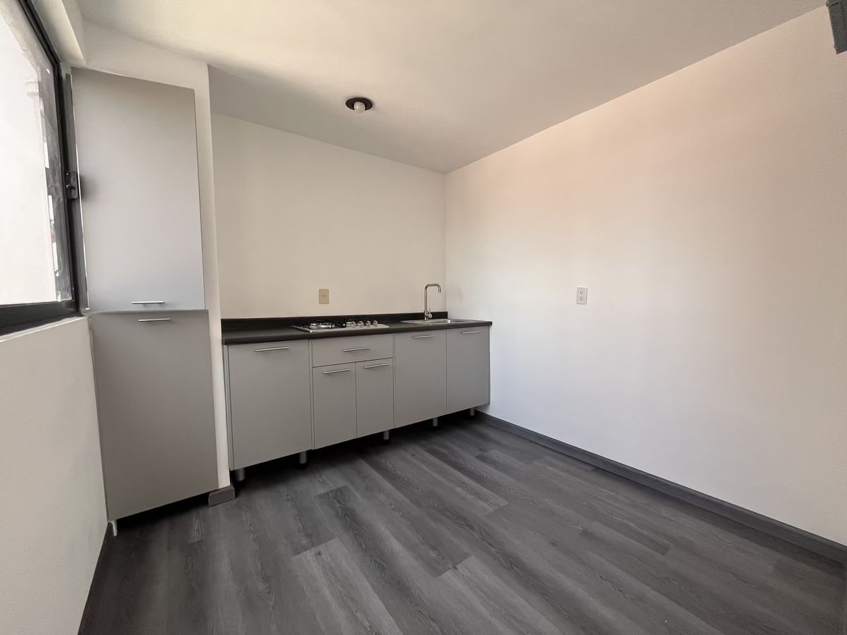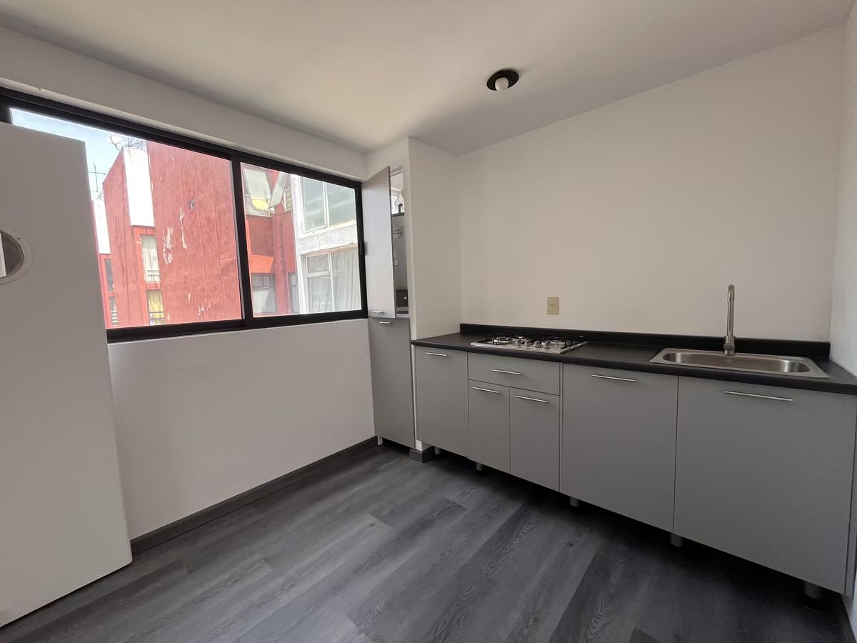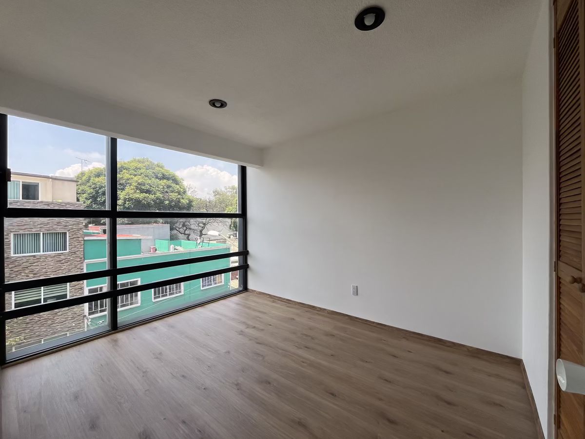 Departamento exterior en venta. Consta de dos recámaras, dos baños completos, los dos con ventilación natural, estancia con balcón, cocina integral, amplio cuarto de servicio en la azotea con instalación para lavadora y secadora, 2 cajones de estacionamiento.