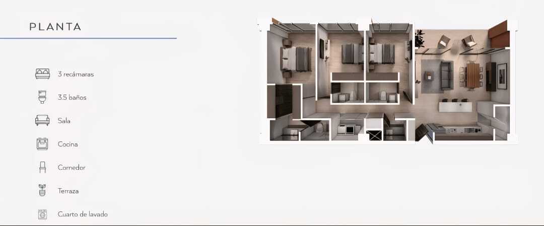 Cuenta con 3 amplias recámaras, 3 baños y medio, y 3 lugares de estacionamiento independientes (no en tándem). Su diseño combina elegancia y funcionalidad, con acabados de lujo y espacios bien iluminados.