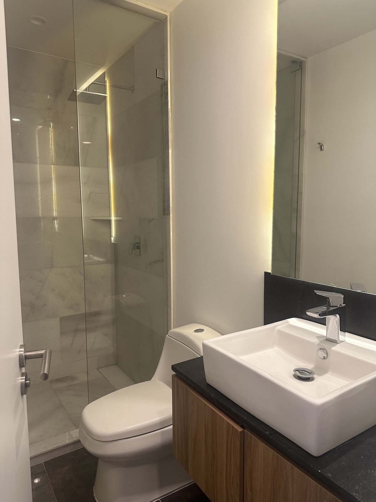 Cuenta con dos recámaras, cada una con baño completo; la principal con walk-in closet. Además, tiene un medio baño para visitas y un espacio versátil que puede funcionar como oficina, estudio o incluso una tercera recámara. La cocina es amplia y funcional, y la sala-comedor tiene acceso directo al balcón. Los acabados son de lujo, con carpintería residencial y detalles que elevan la experiencia de vivir en este desarrollo.