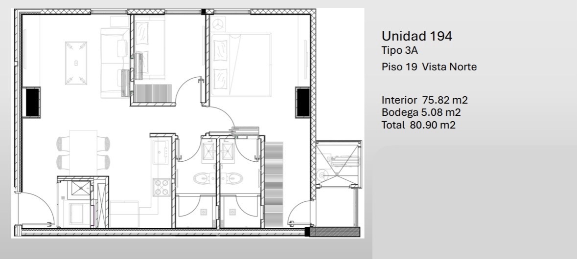 Tipo 3A: 75.82 m² + 5.08 m² de bodega