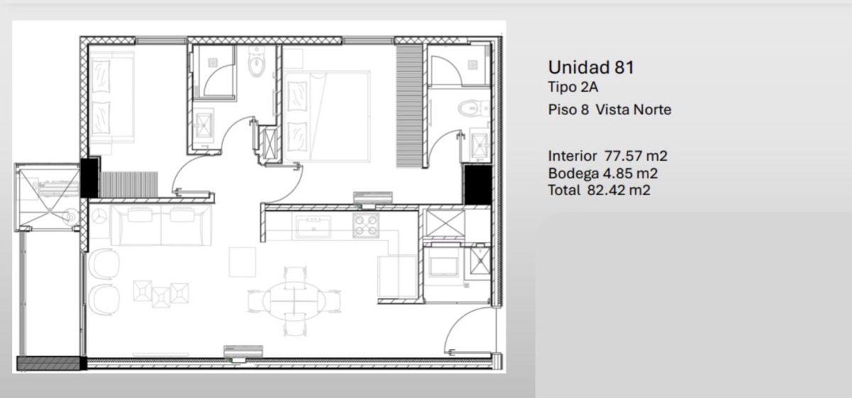 Tipo 2A: 77.57 m² + 4.85 m² de bodega