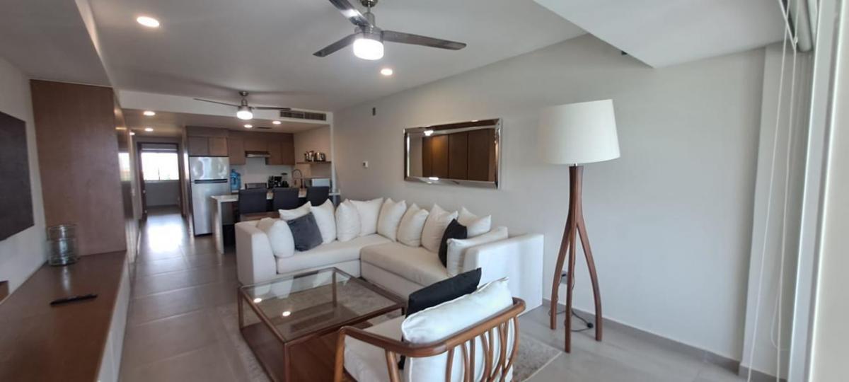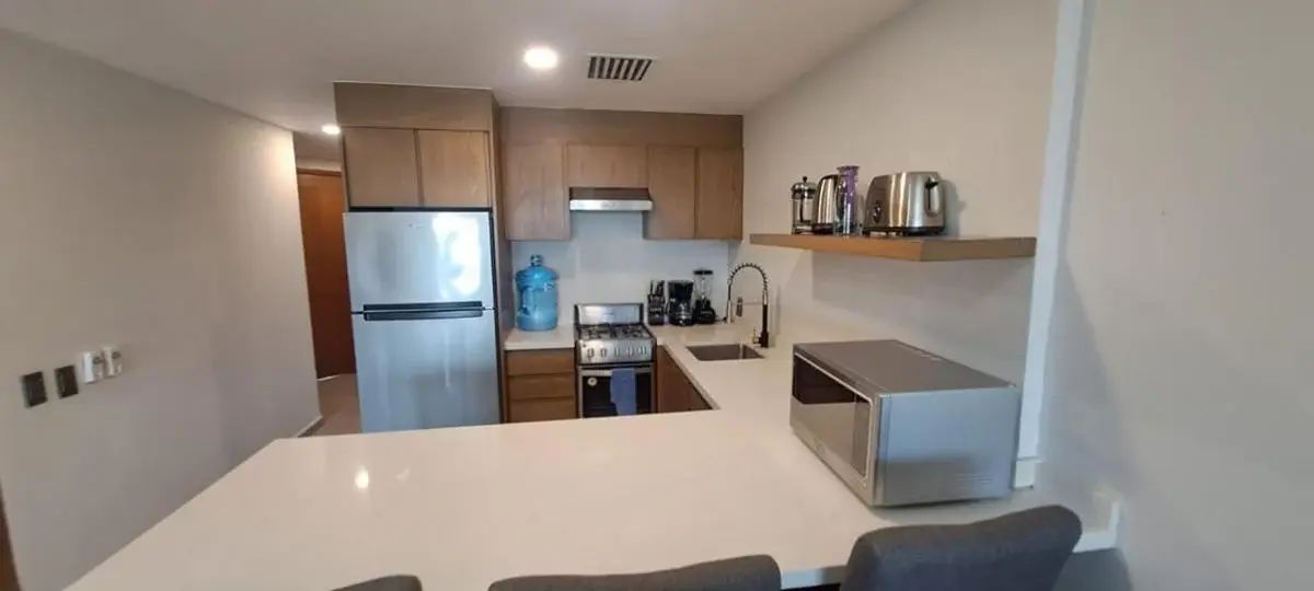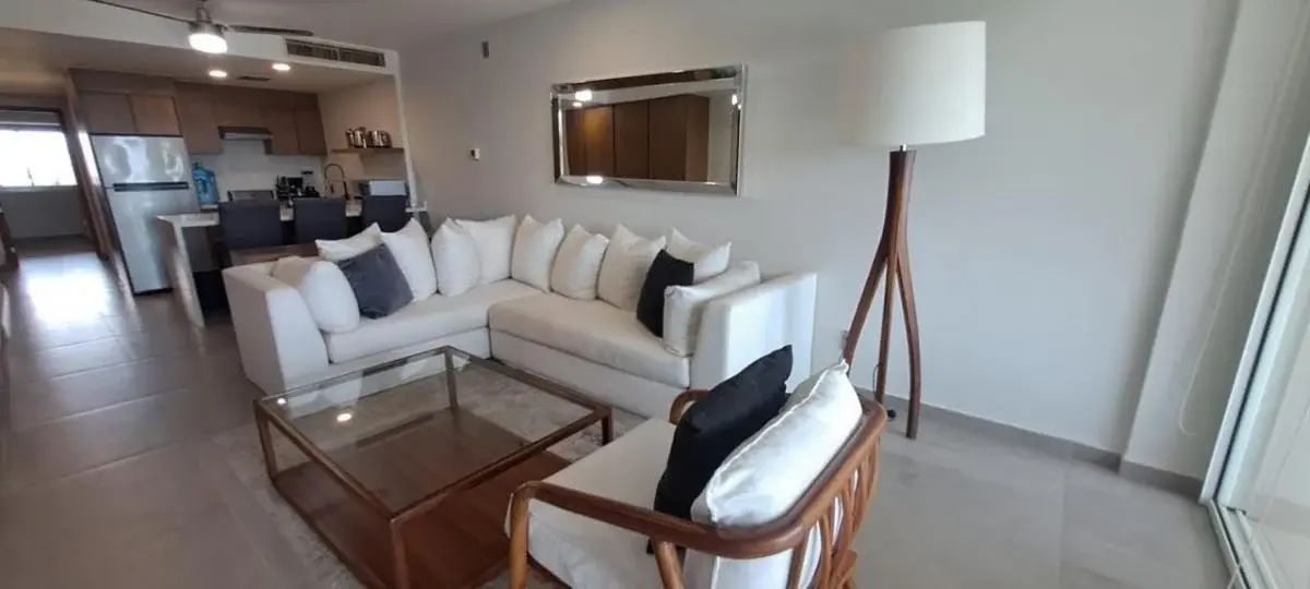 El departamento cuenta con una recamara con baño completo, area de lavado, cocina con excelentes terminados, sala, comedor y un amplio balcon con vista al mar.