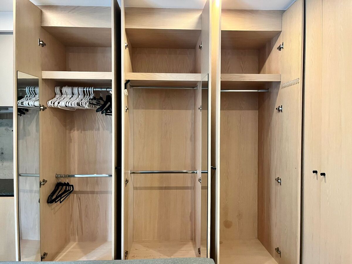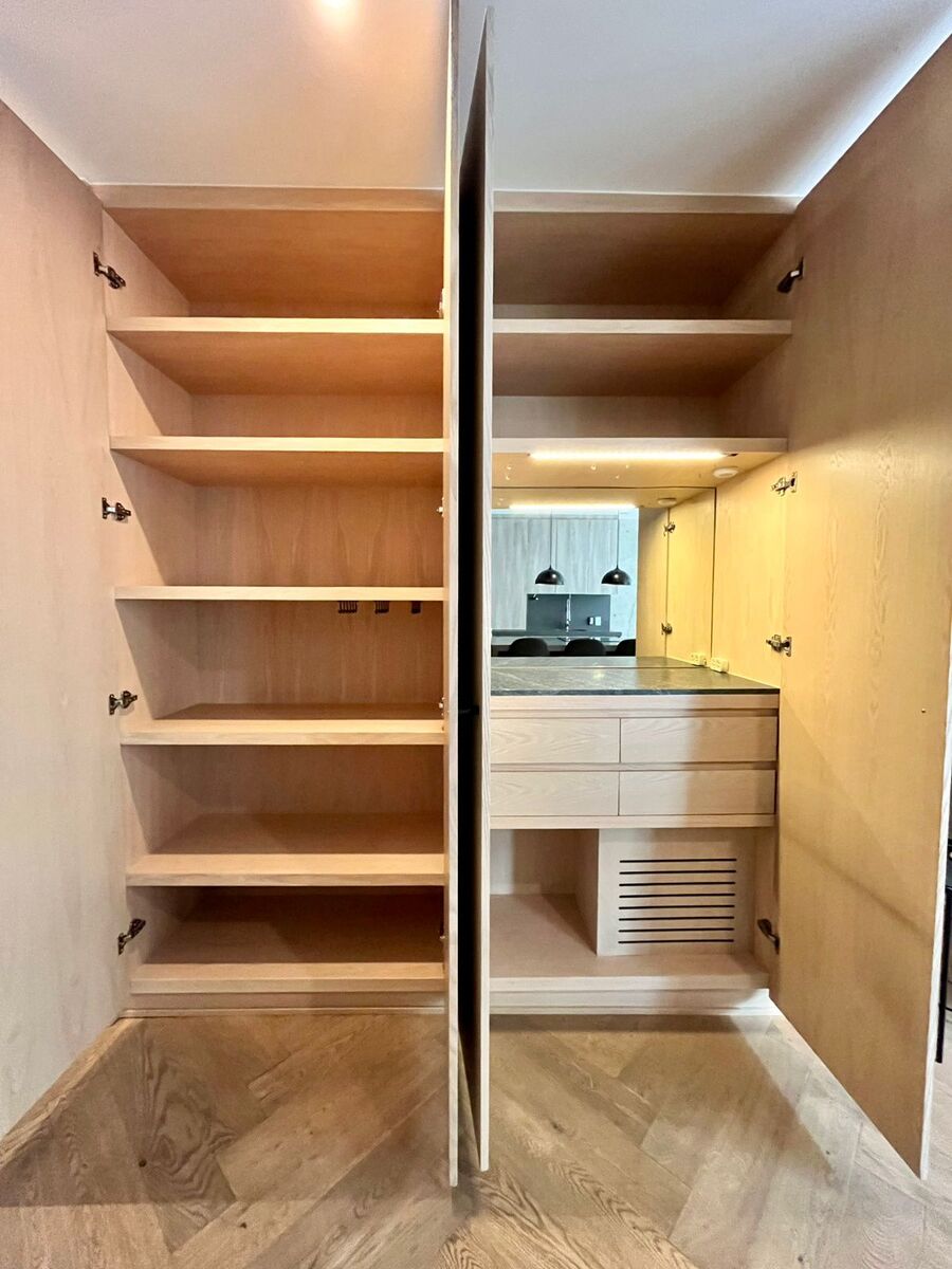 Televisión oculta y retráctil con control remoto, muebles de diseñador incluido.