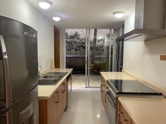 3 recámaras, 2.5 baños, sala con terraza, comedor, family, cocina integral (incluye: refrigerador, lava vajillas, lavadora y secadora de ropa), la cocina con terraza, cuarto de servicio, área de lavado, 2 cajones de estacionamiento-que cuentan con entrada desde el estacionamiento directo al departamento, vigilancia 24/7.