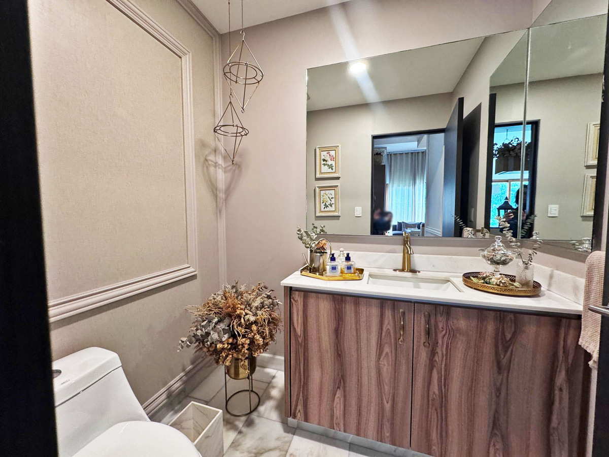 Entrando te recibe un pasillo que te lleva a la espectacular estancia con grandes ventanales que dan hacia el jardín y la terraza, también se encuentra la amplia cocina con desayunador, el área de lavado y el cuarto de servicio