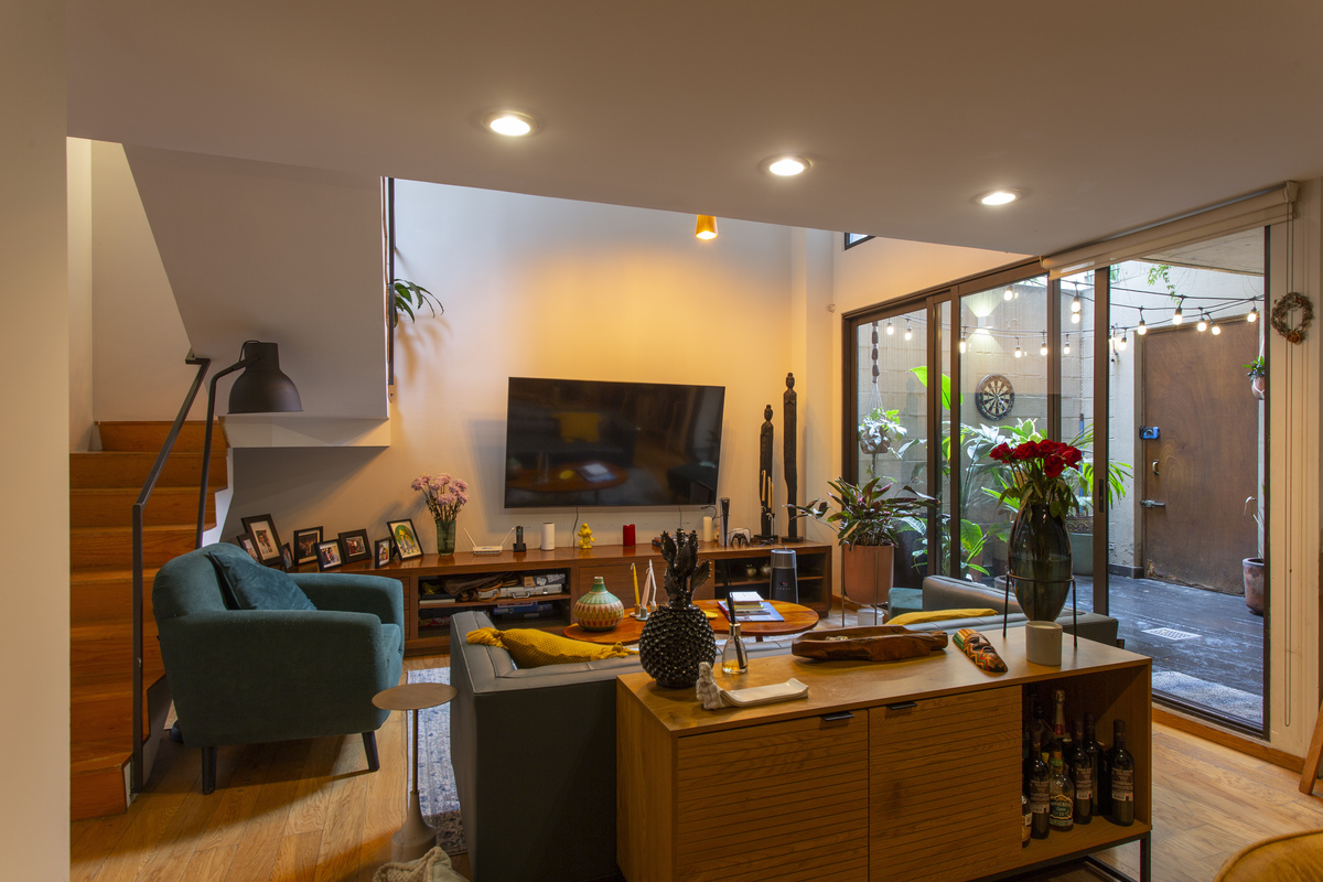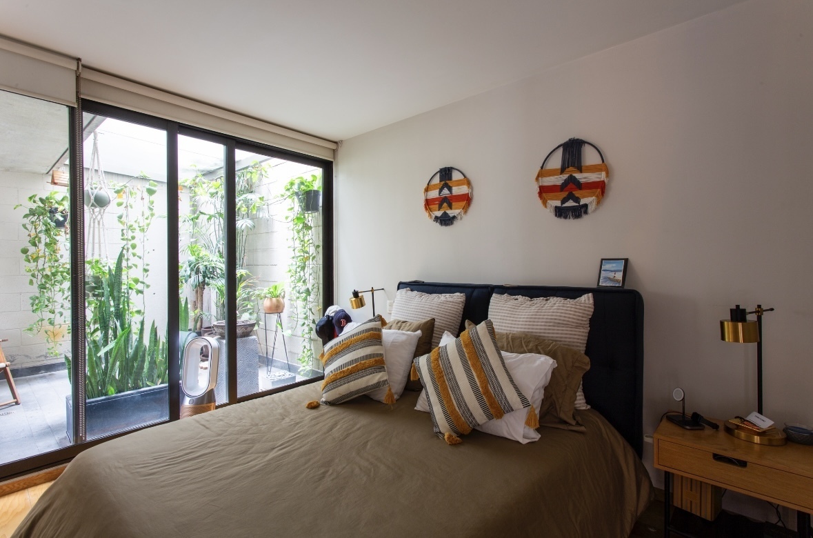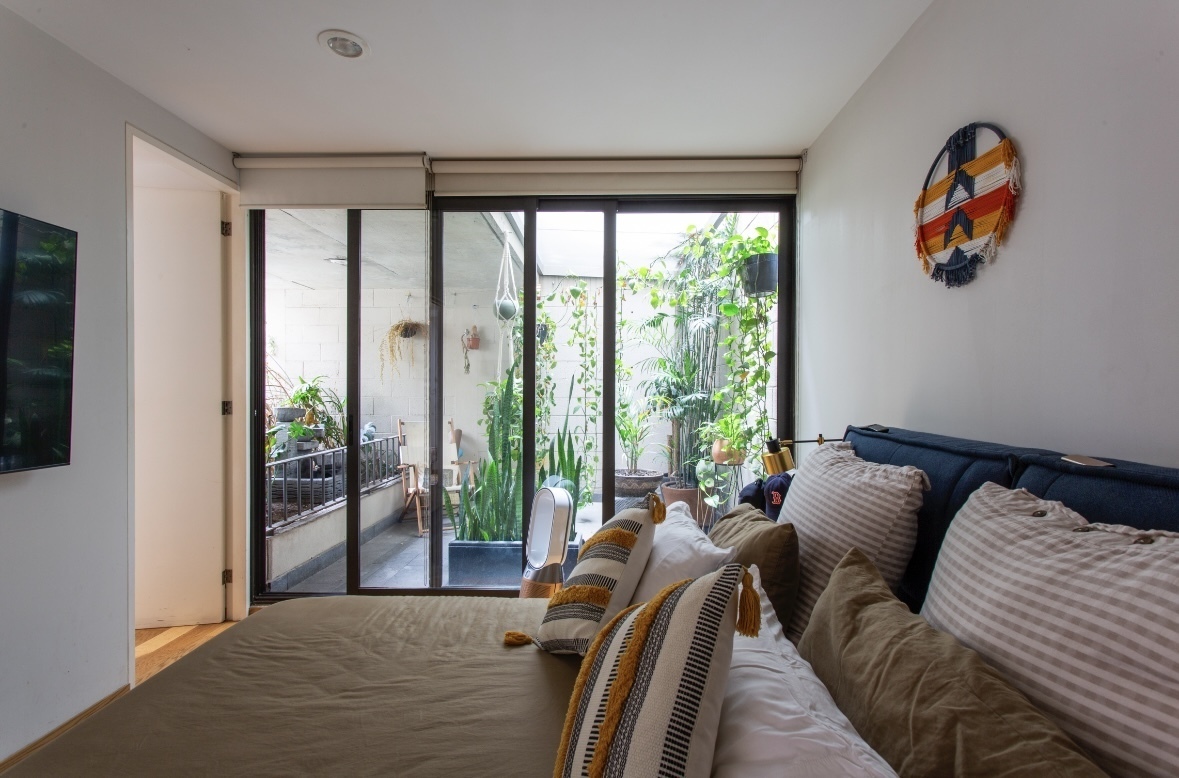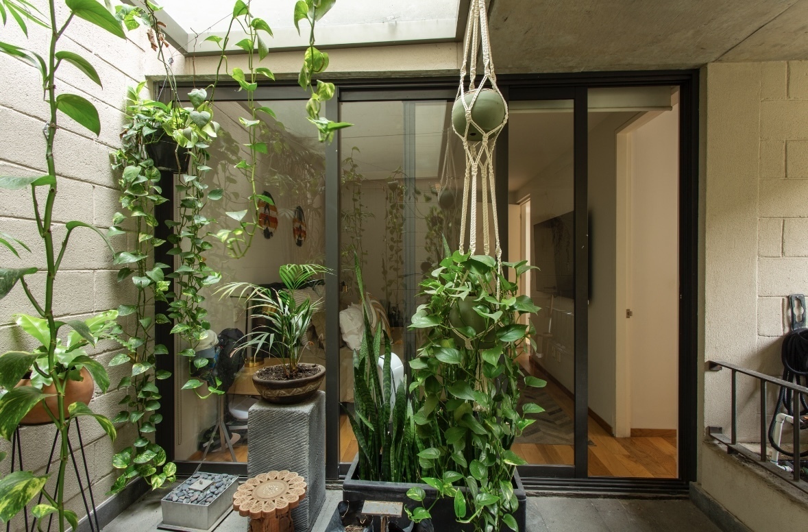 Al ingresar al departamento recibe un patio interior conectado con la sala comedor, el cual cuenta además de una doble altura en la sala.
