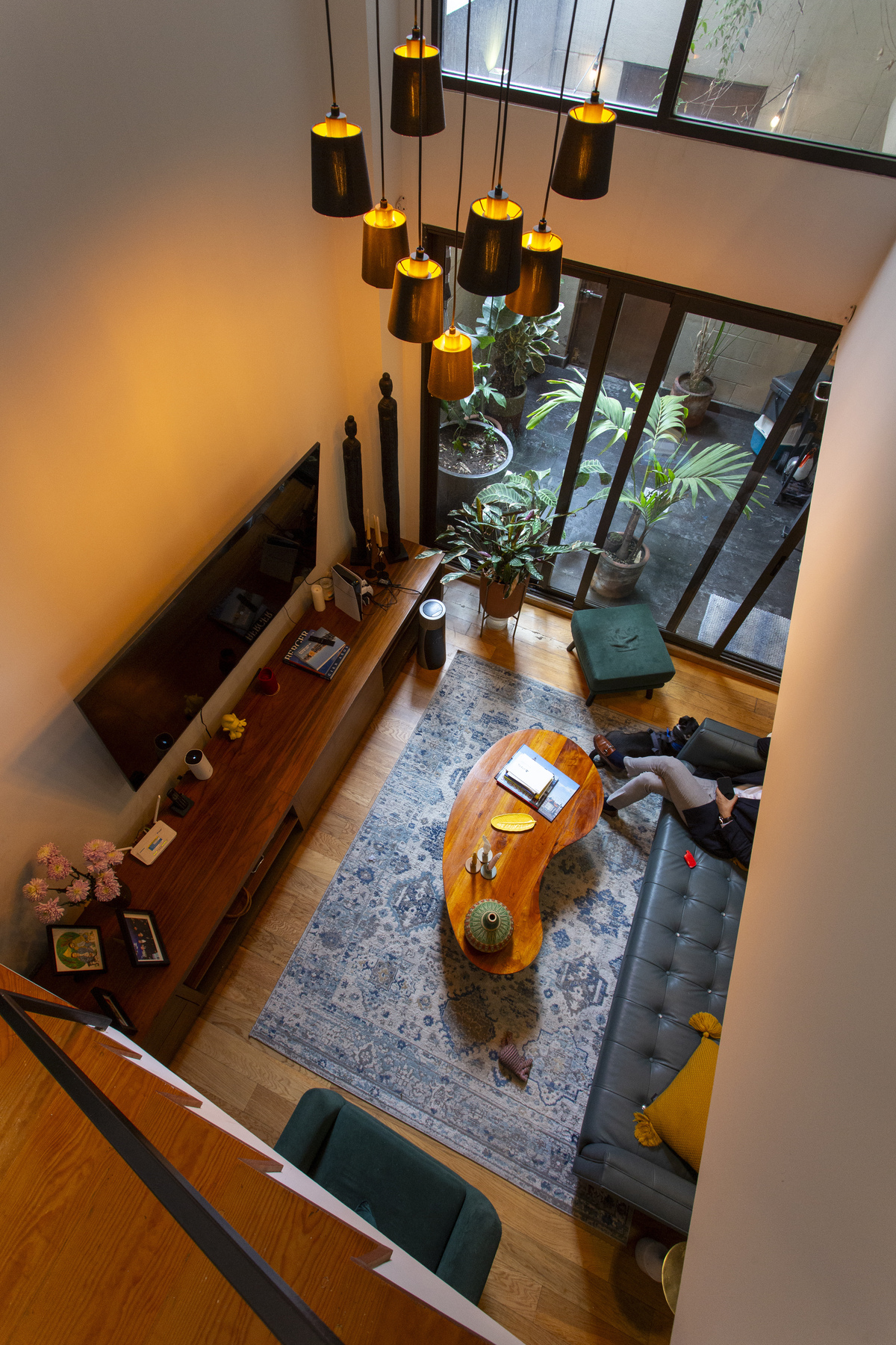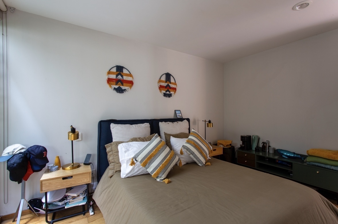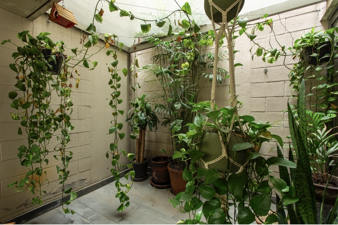 Al ingresar al departamento recibe un patio interior conectado con la sala comedor, el cual cuenta además de una doble altura en la sala.