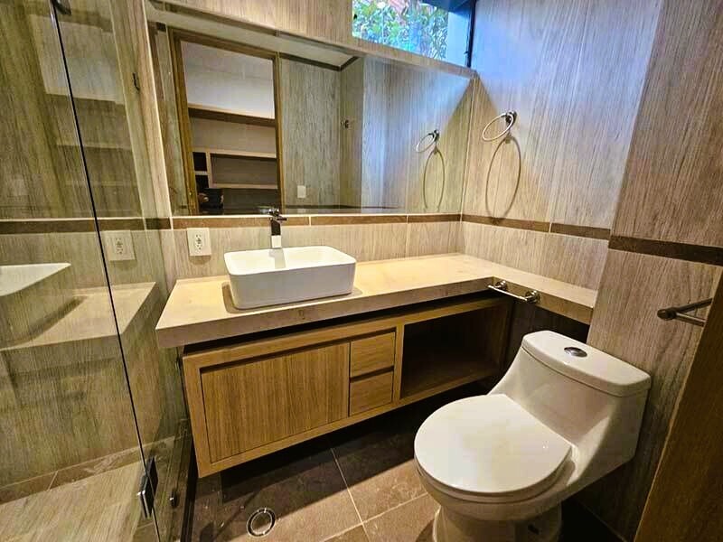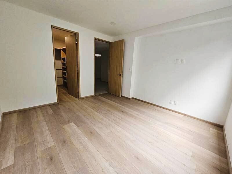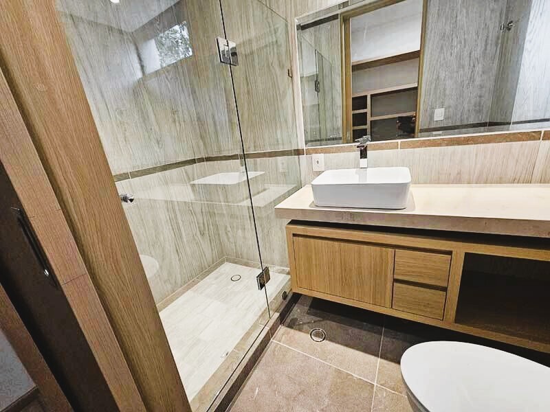 TIENE TRES RECÁMARAS, CADA UNA CON VESTIDOR Y BAÑO, ADEMÁS DE UN MEDIO BAÑO DE VISITAS. LA ESTANCIA Y EL COMEDOR SE ABREN HACIA LA TERRAZA, LO QUE APORTA AMPLITUD Y VENTILACIÓN AL ÁREA SOCIAL.