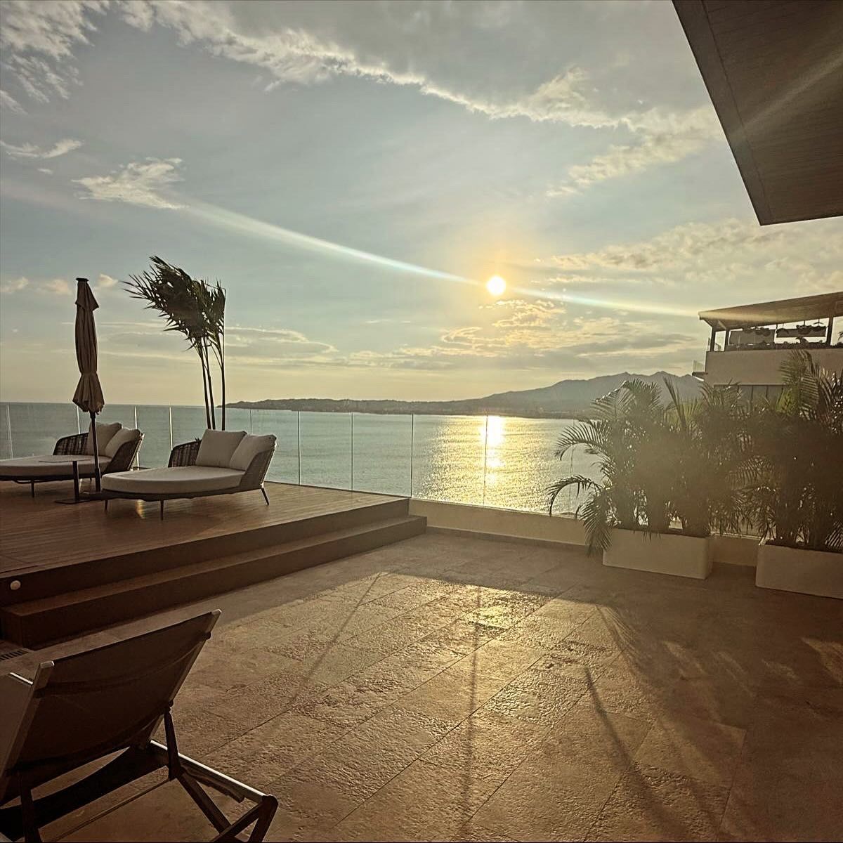 cocina sala y comedor con una vista espectacular al mar y una amplia terraza.