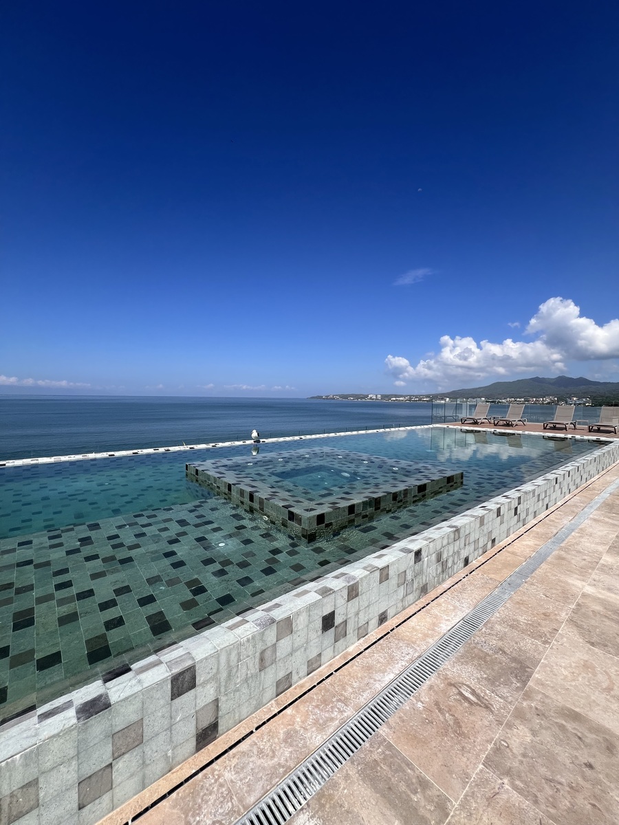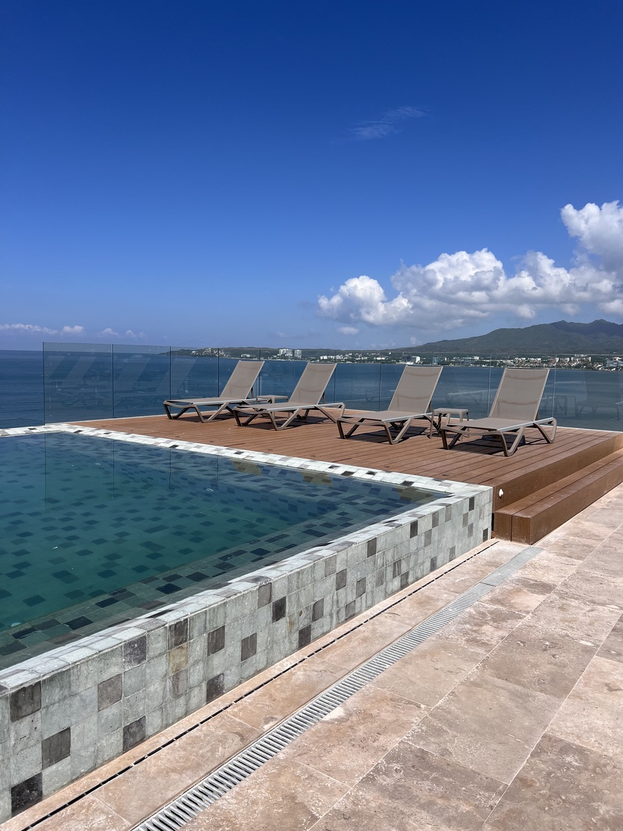 Torre con alberca en planta baja y terraza, alberca con vista panorámica en el roof top, asoleadereos, sky bar, gym.