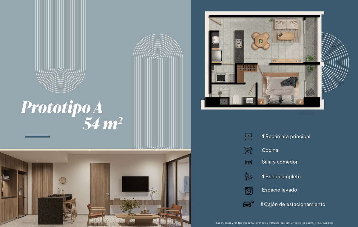 Prototipo A: Área: 54 m2, Recámara: 1, Baño: 1, Estacionamiento: 1 Cajón, Otras características: Cocina, Sala y comedor, Espacio lavado.