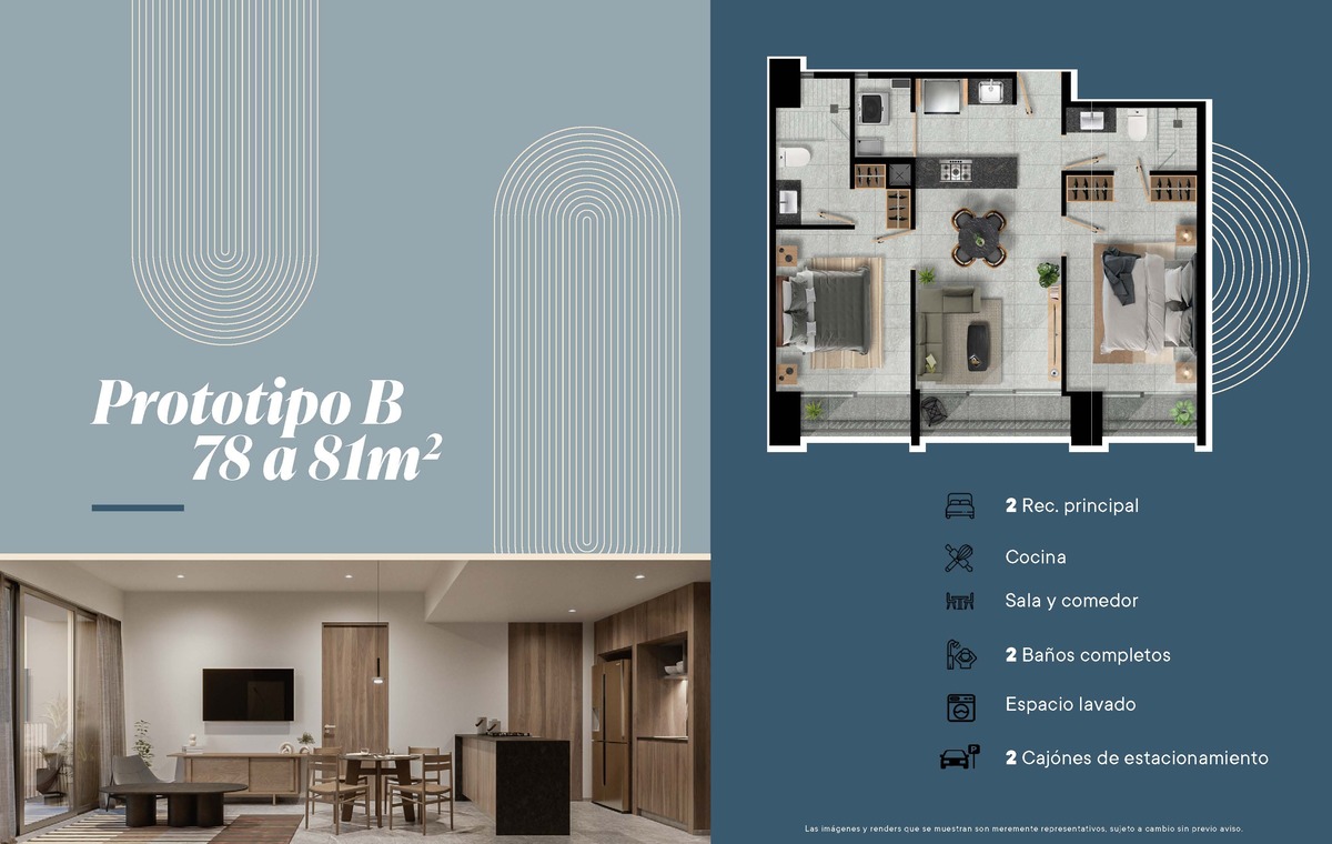 Prototipo B: Área: 78 a 81 m2, Recámaras: 2, Baño: 2, Estacionamiento: 2 Cajones, Otras características: Cocina, Sala y comedor, Espacio lavado.