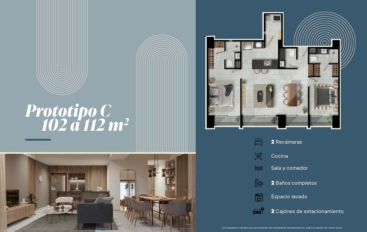 Prototipo C: Área: 102 a 112 m2, Recámaras: 2, Baño: 2, Estacionamiento: 2 Cajones, Otras características: Cocina, Sala y comedor, Espacio lavado.