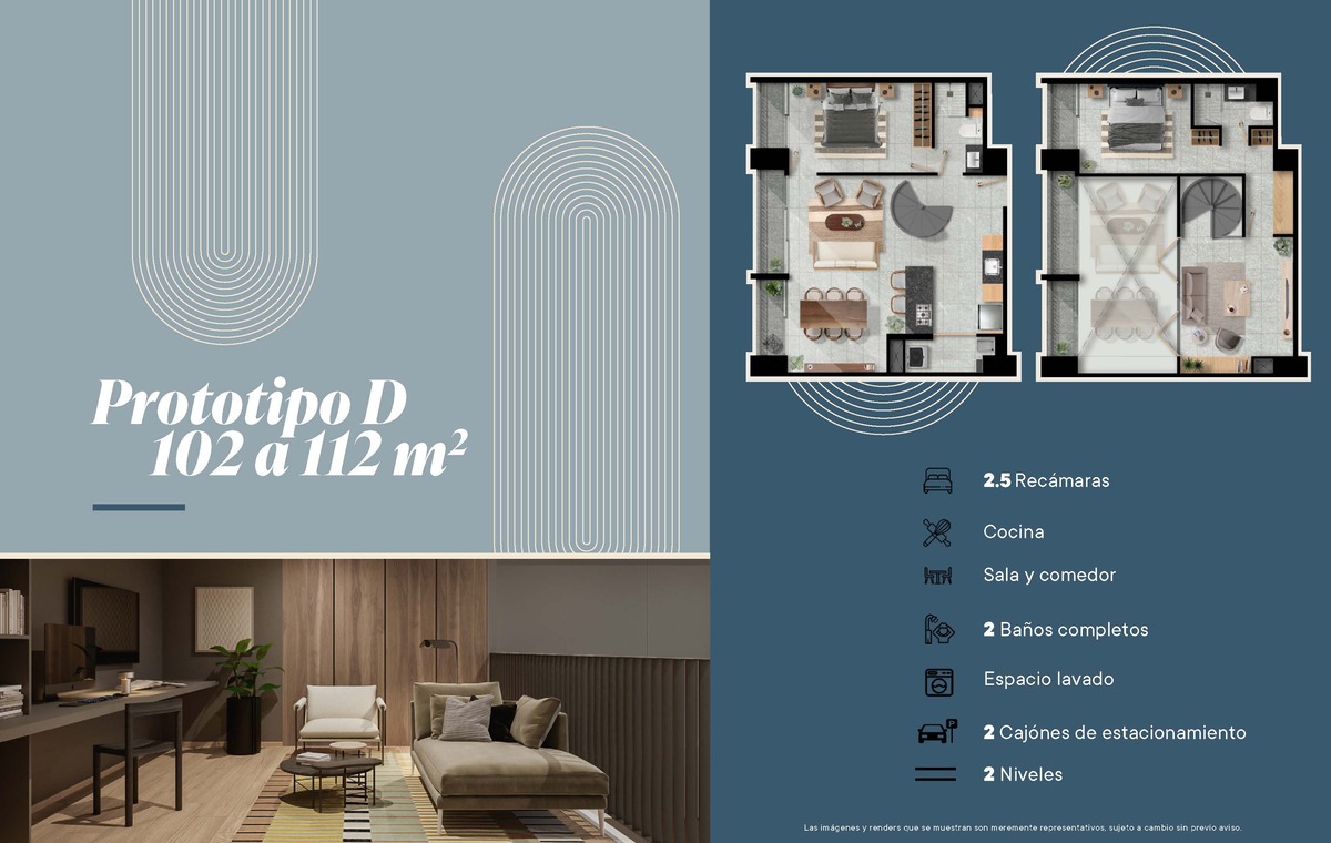 Prototipo D: Área: 102 a 112 m2, Recámaras: 2.5, Baño: 2, Estacionamiento: 2 Cajones, Otras características: Cocina, Sala y comedor, Espacio lavado, 2 Niveles.