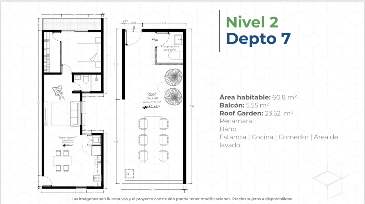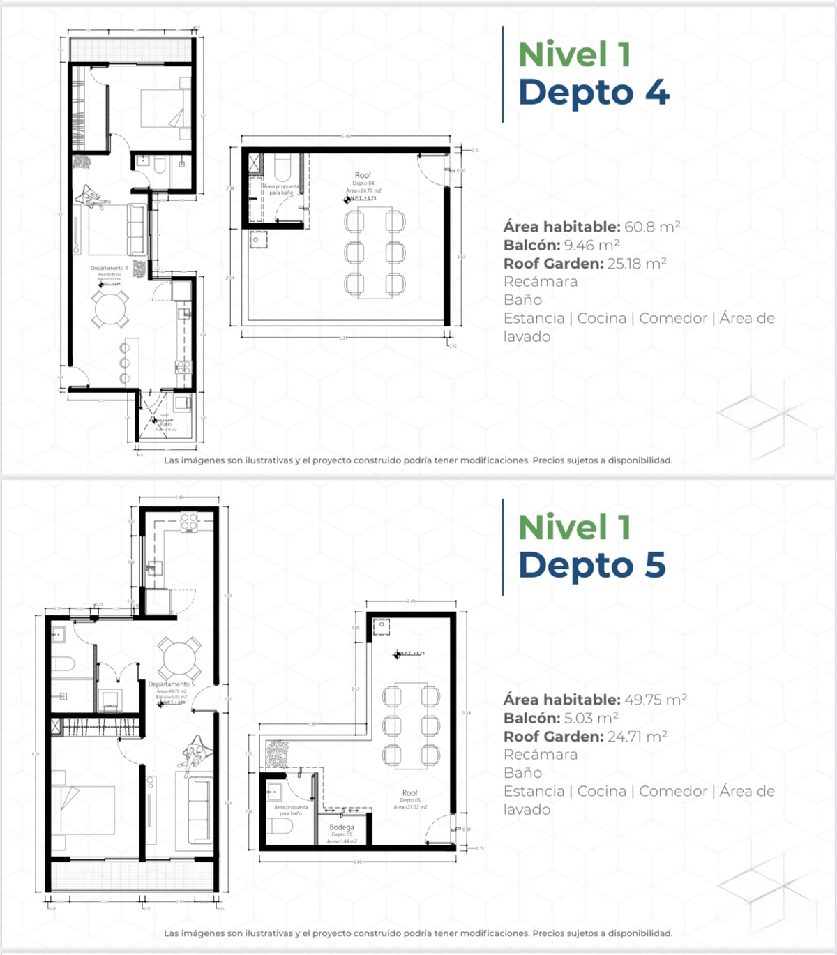 Los departamentos cuentan con cocina abierta que se integra a la estancia, con ventanales de piso a techo, una recámara con balcón, un baño, roof garden privado y Gym común, así como 1 lugar de estacionamiento.