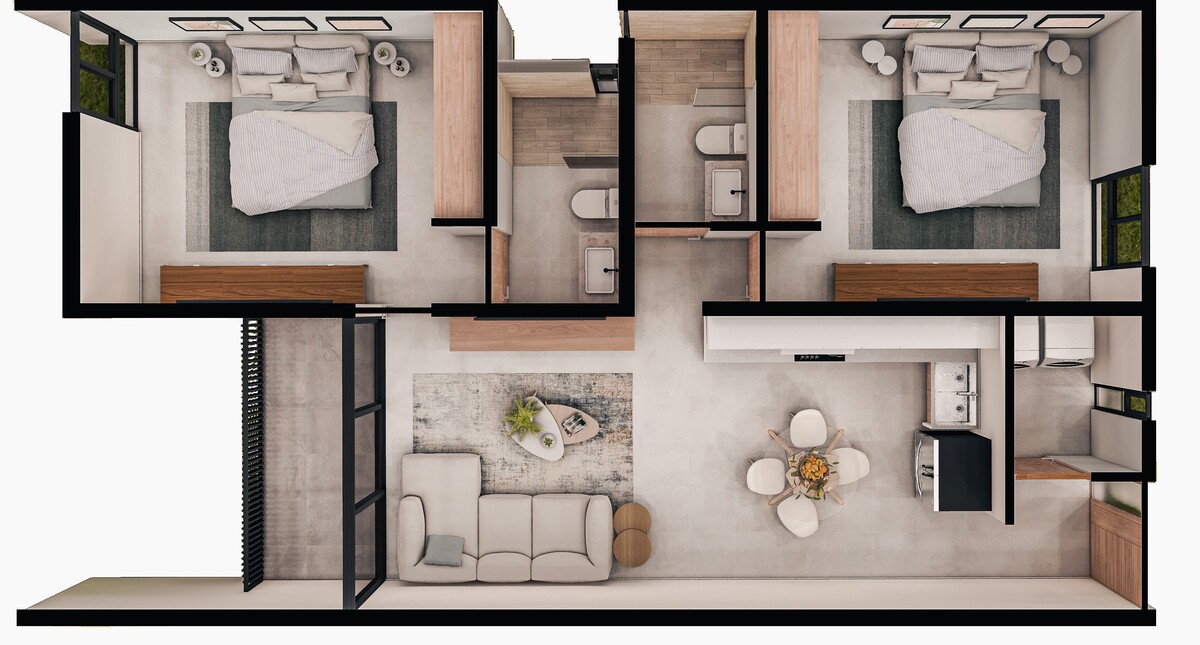 Ofrece espacios cómodos y funcionales, diseñados para aprovechar al máximo cada metro cuadrado, con un estilo contemporáneo que combina materiales de la región, acero y una paleta de colores cálidos que armonizan con la vegetación del entorno.