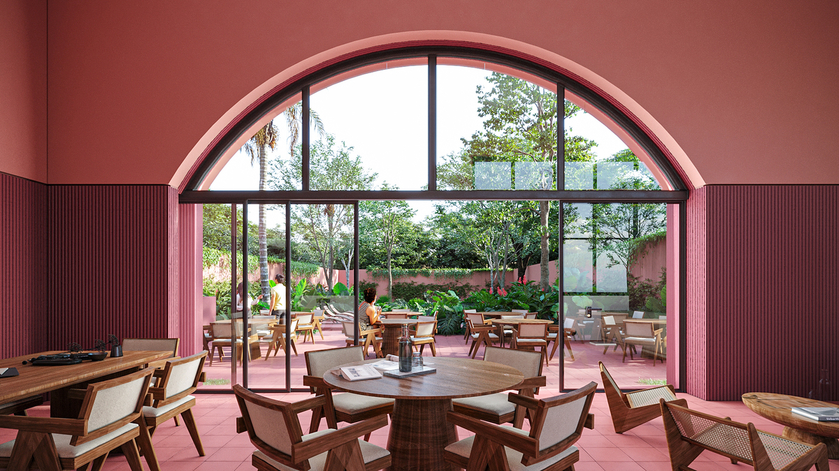 con piscina, área de restaurante, lobby. y parque central. Zona de bicis.