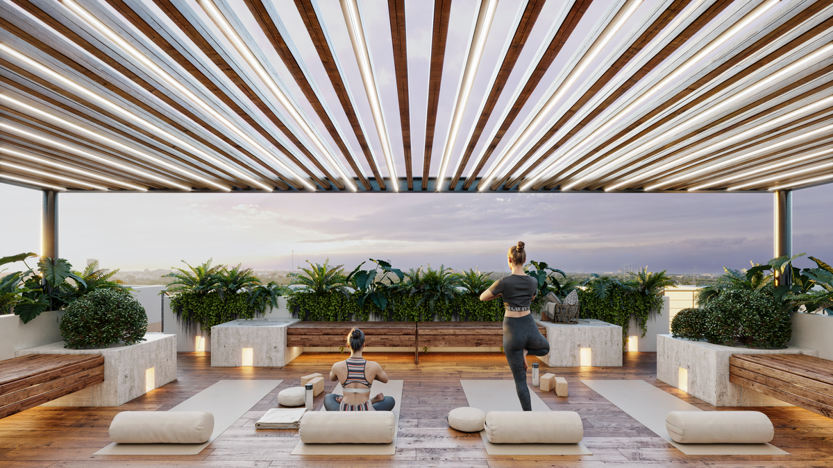 Para el disfrute de sus residentes, el complejo cuenta con un sports bar, ideal para socializar; un green de golf, perfecto para la práctica y recreación; una terraza social, diseñada para reuniones; una terraza con alberca, enfocada en el descanso, y una terraza con zona zen, pensada para la relajación.