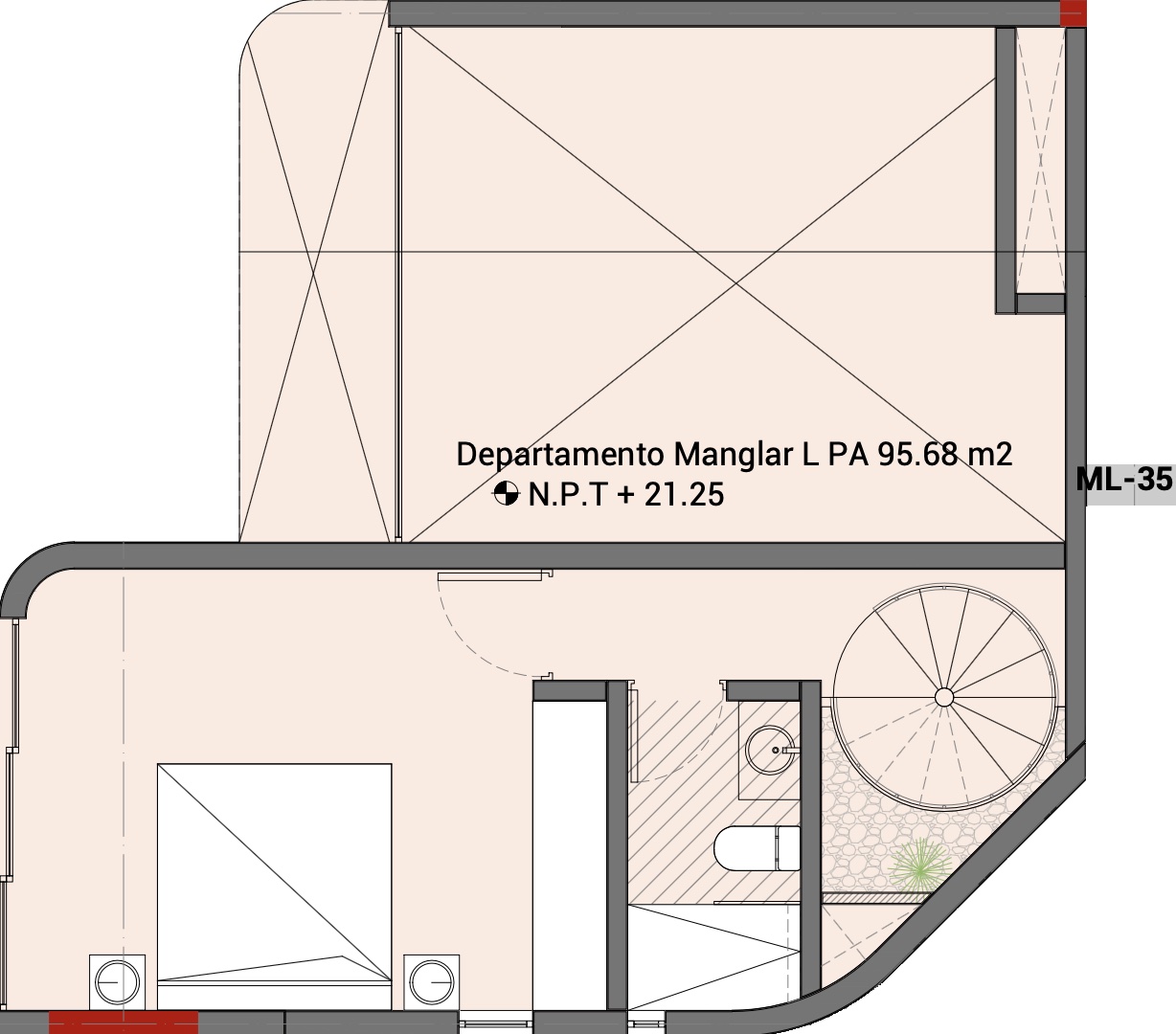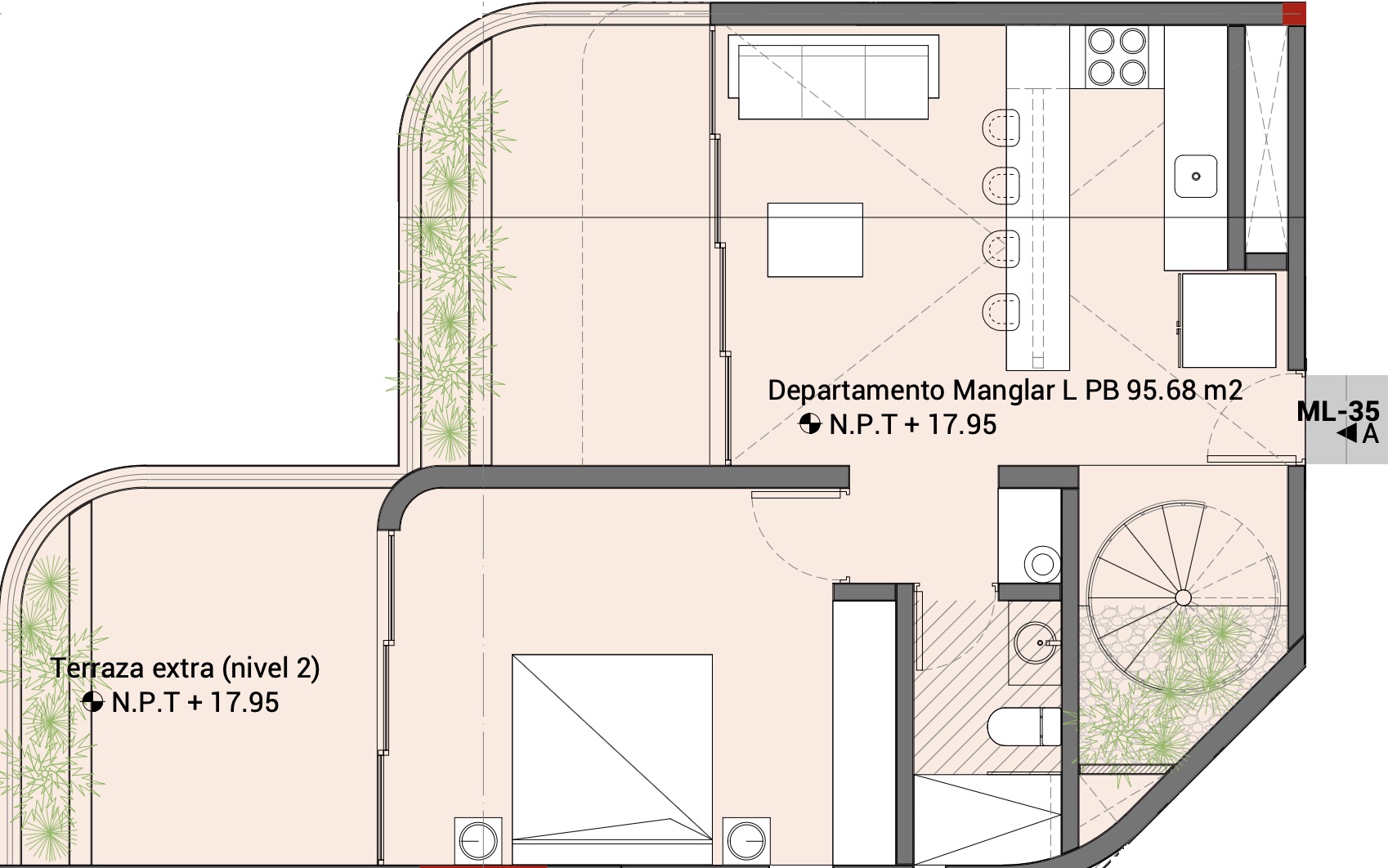 El departamento Manglar large es un departamento de 2 niveles con 2 recámaras.