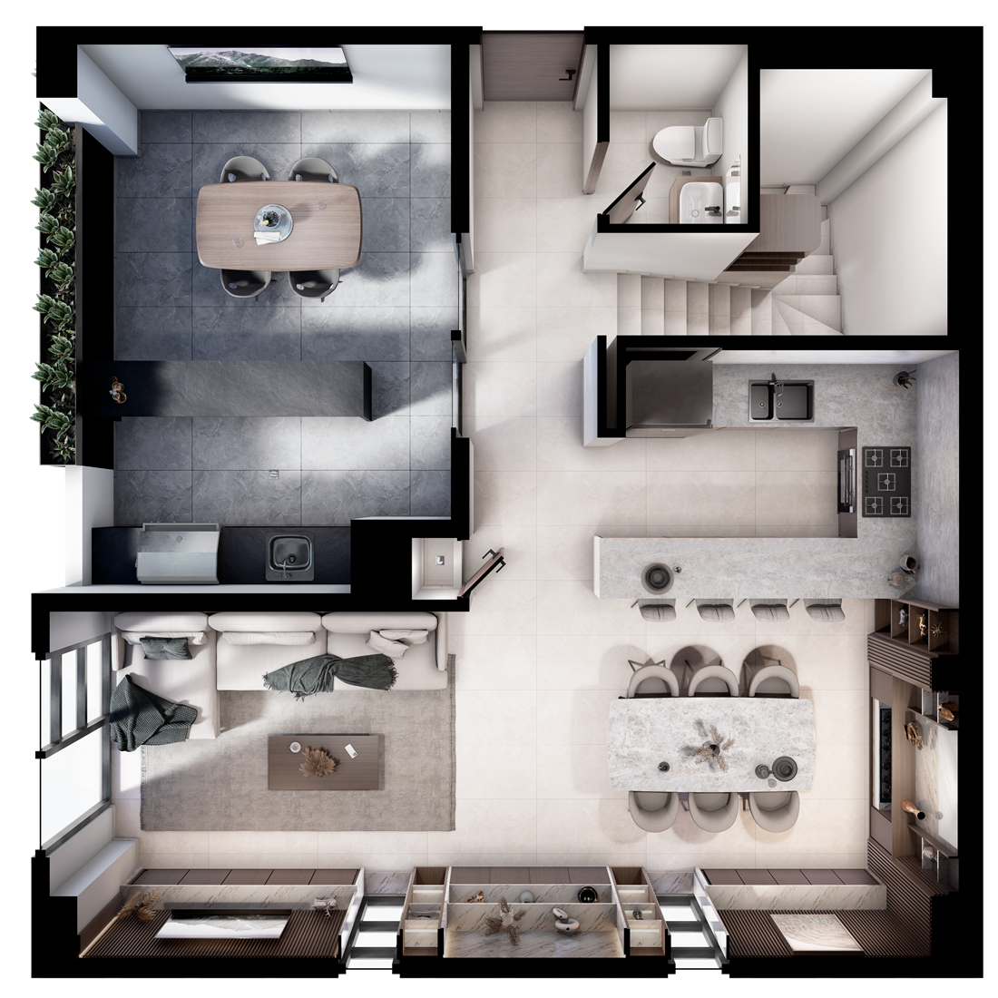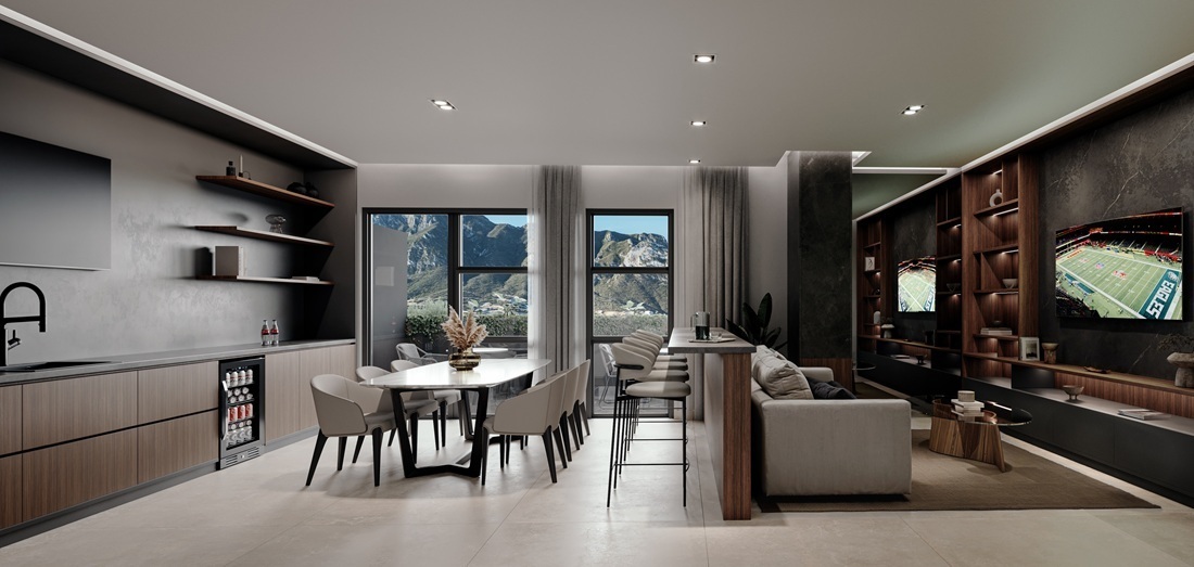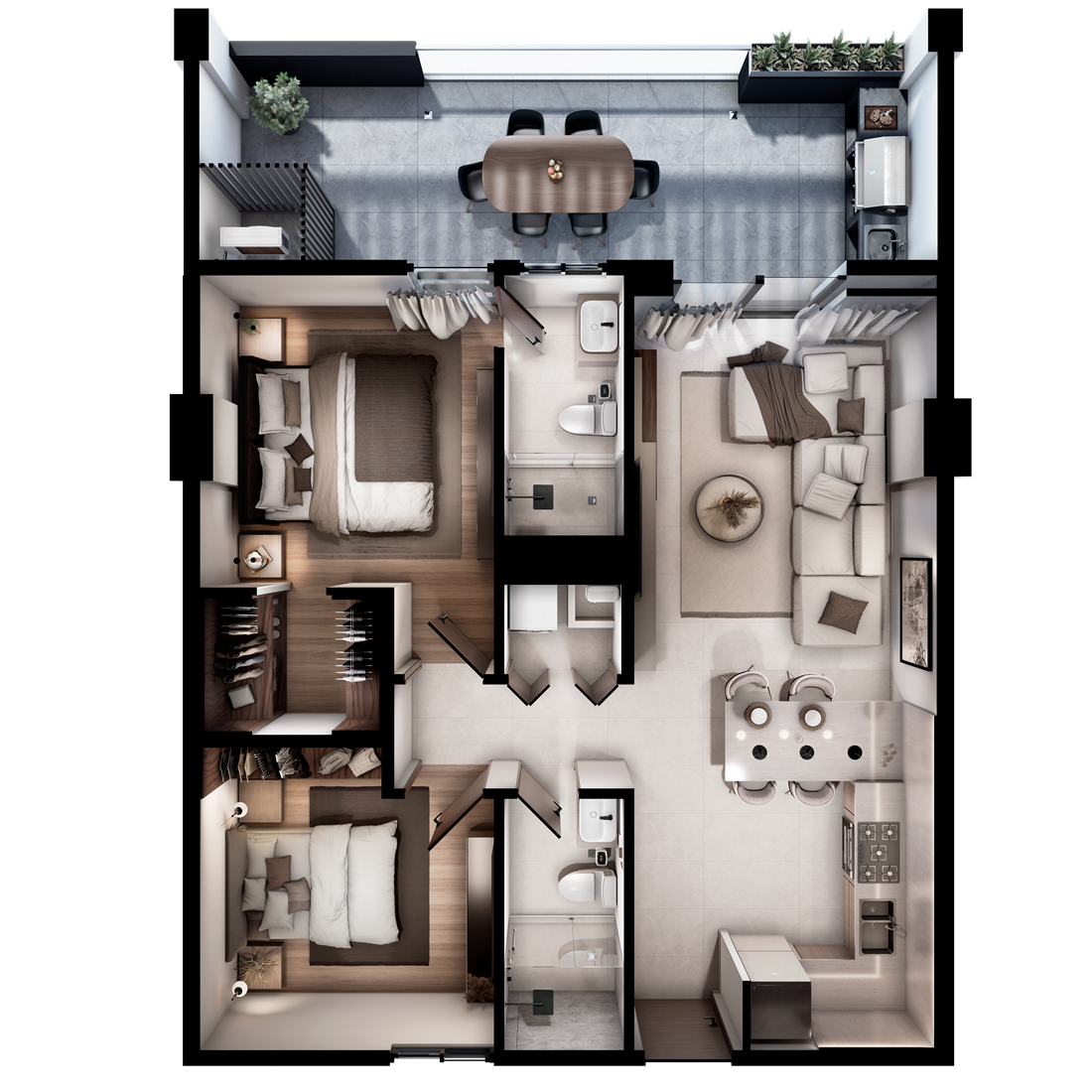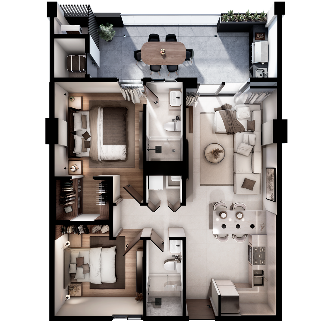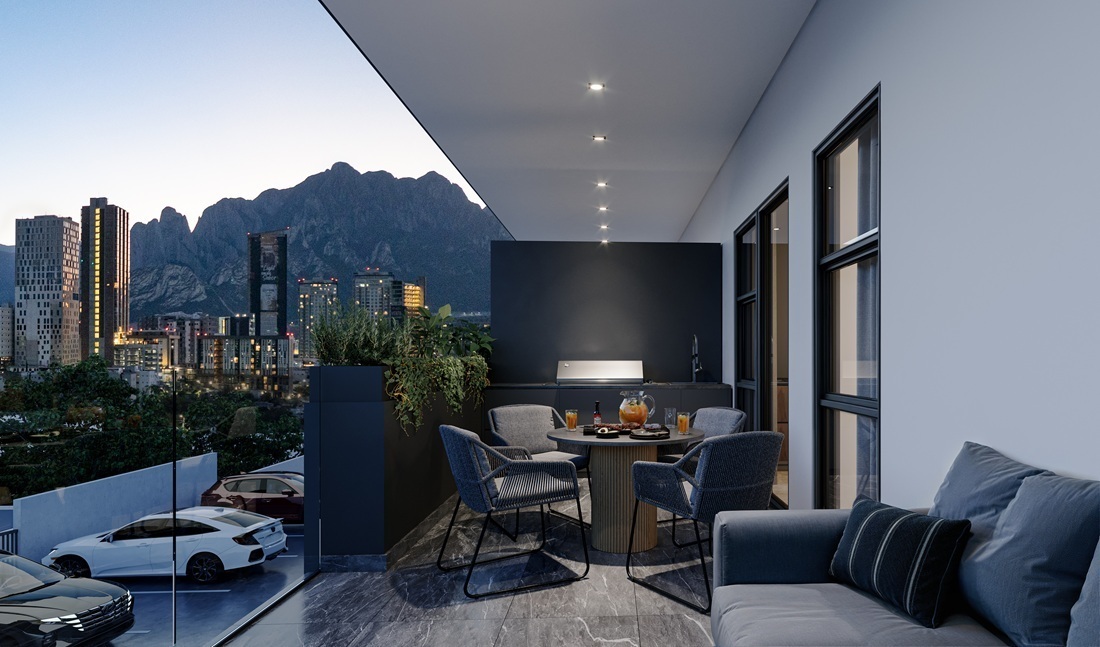 Sala, comedor, cocina, lavandería, 2 balcones, 2 recámaras con walk-in closet, 2.5 baños, terraza con asador, bodega en estacionamiento, 2 cajones de estacionamiento