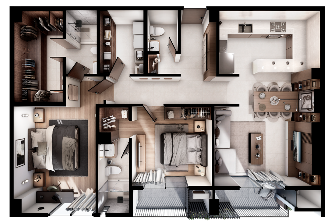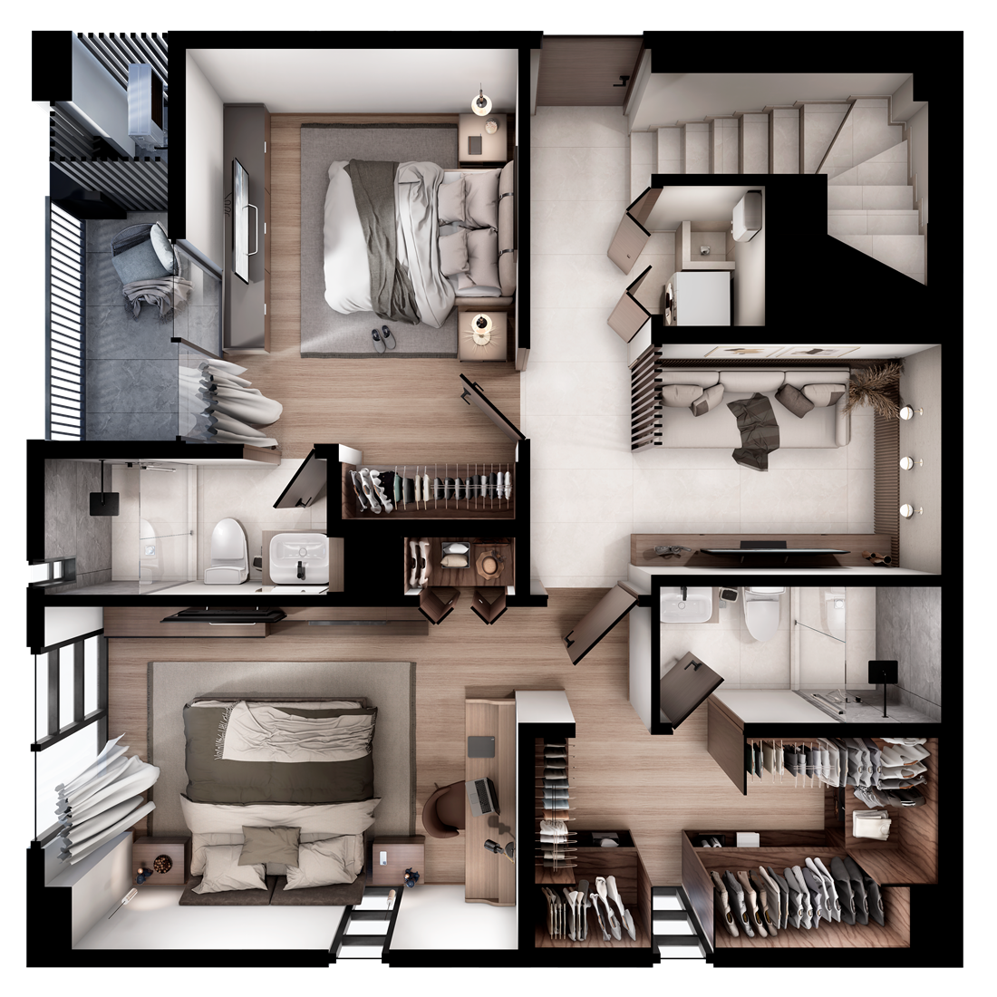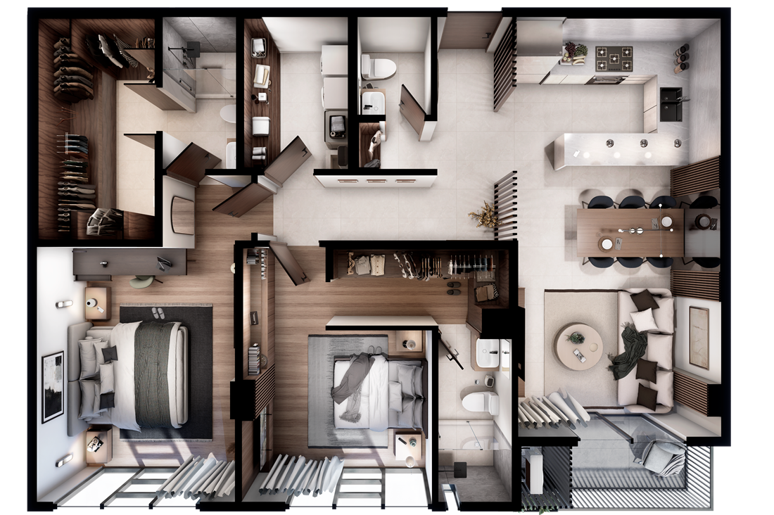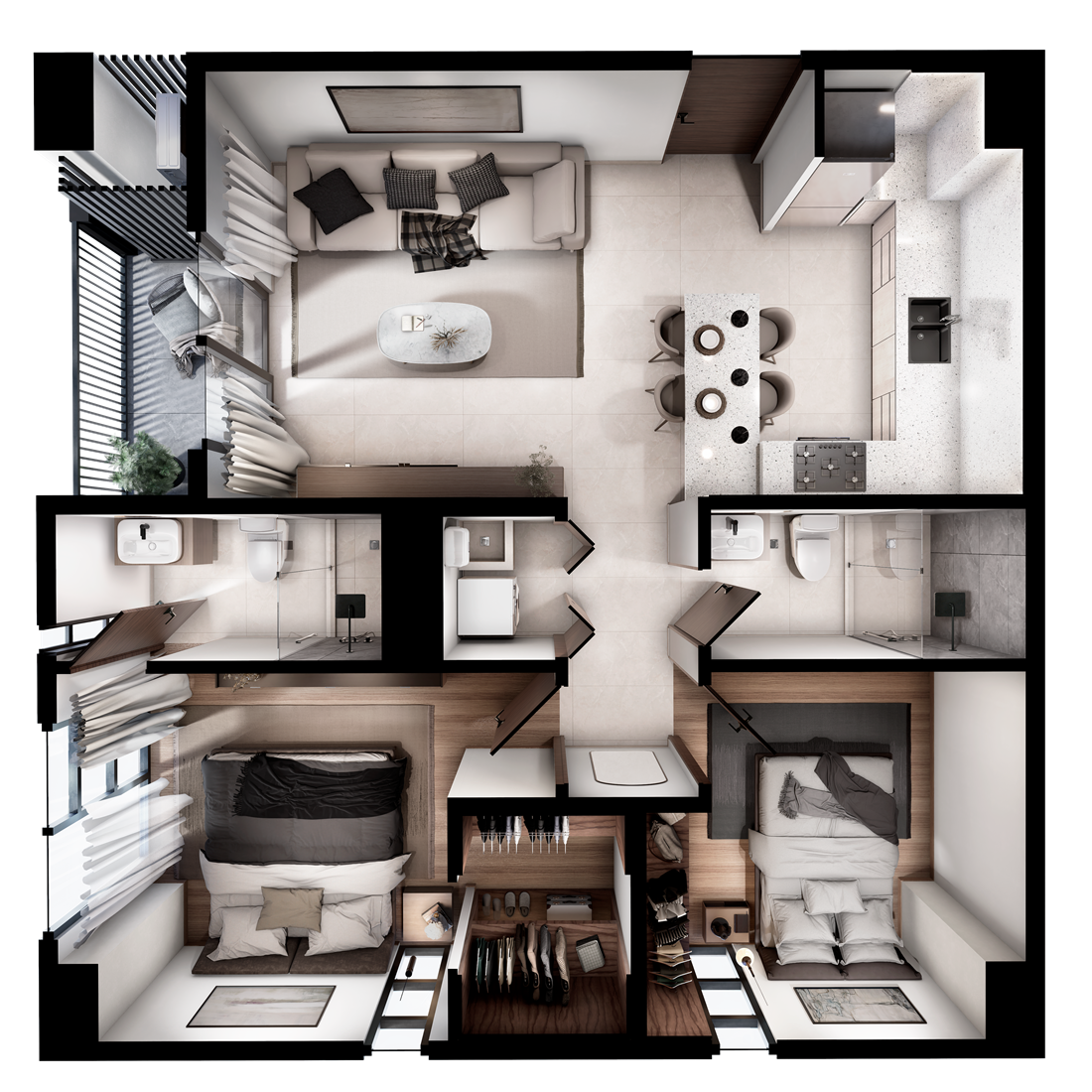 Sala, comedor, cocina, lavandería, 2 balcones, 2 recámaras con walk-in closet, 2.5 baños, terraza con asador, bodega en estacionamiento, 2 cajones de estacionamiento