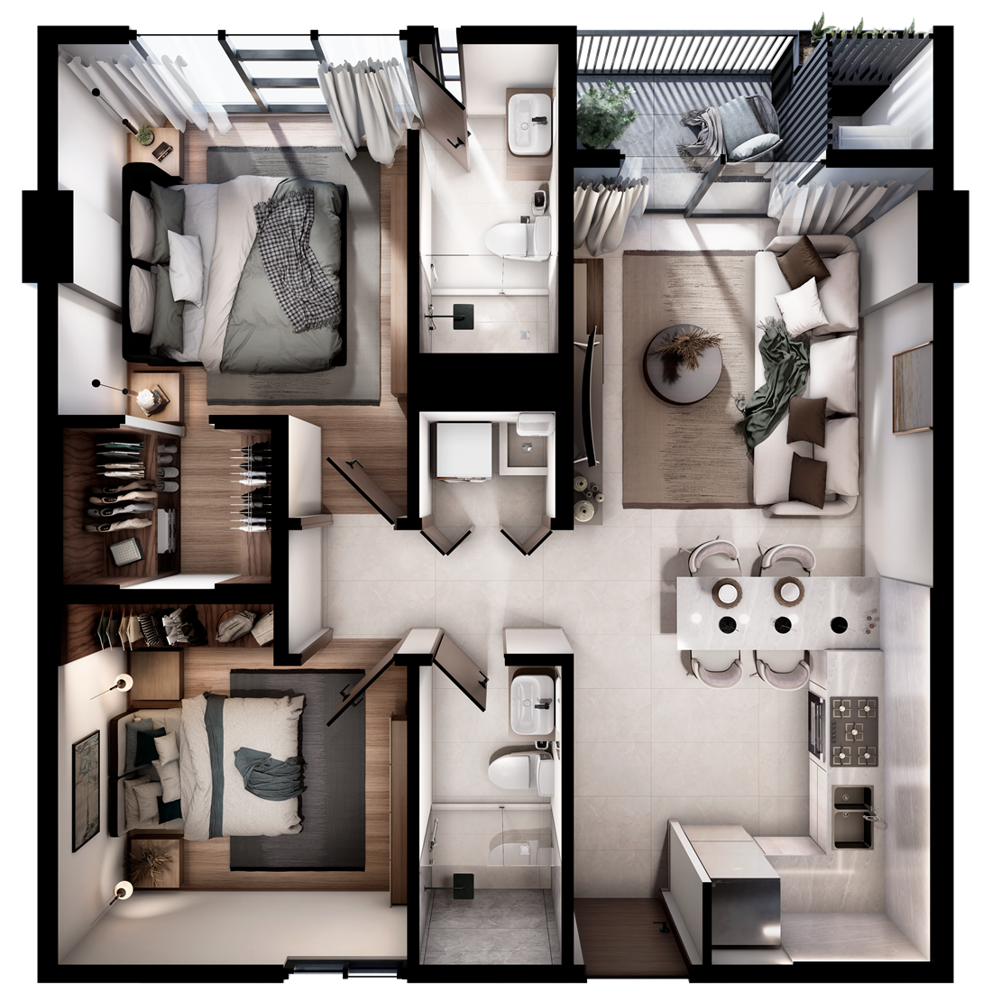 GARDEN B: De 106.14 m2 a 109.80 m2 - 83.70 m2 interior + 26.10 m2 balcón/terraza