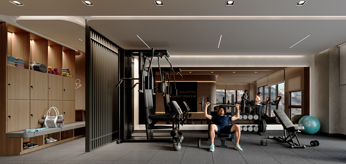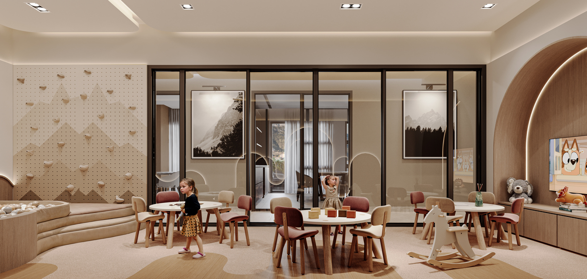interior y exterior, una ludoteca, un gimnasio, dos salones sociales (social rooms) con terraza exterior,