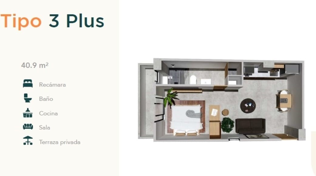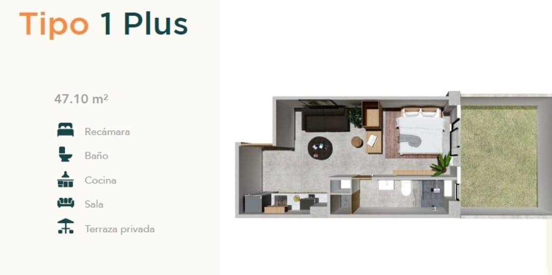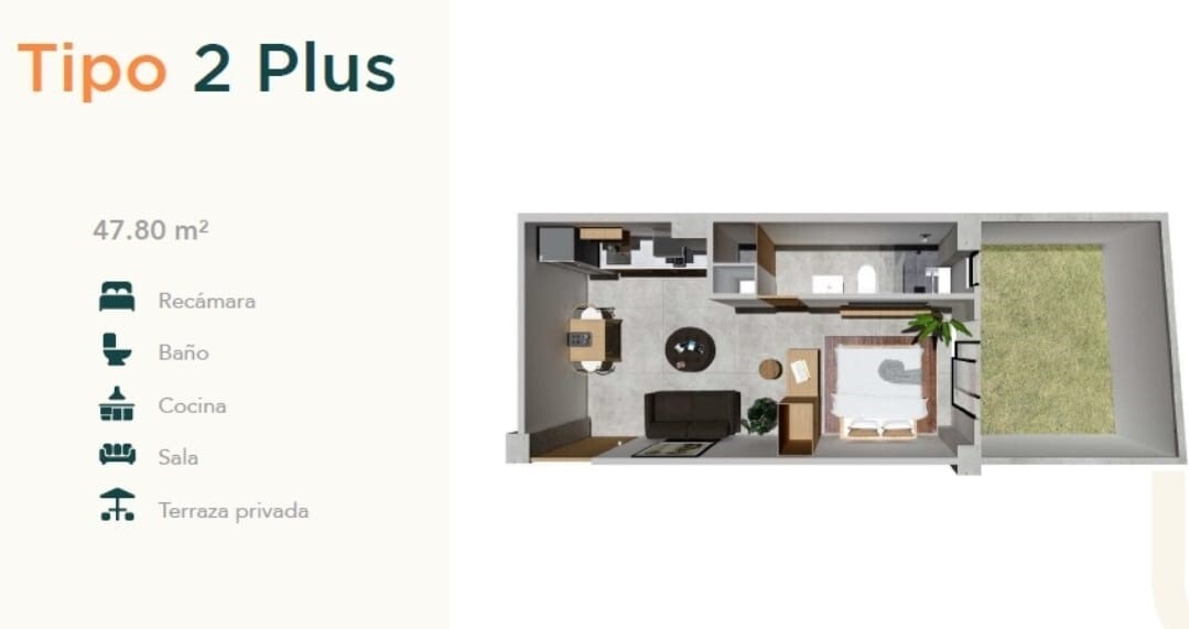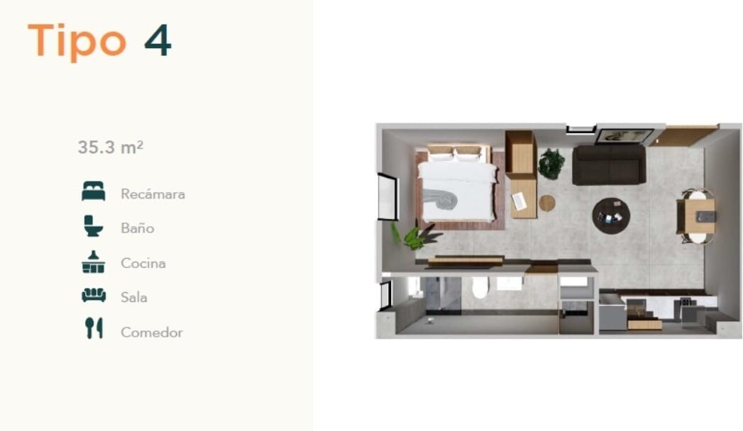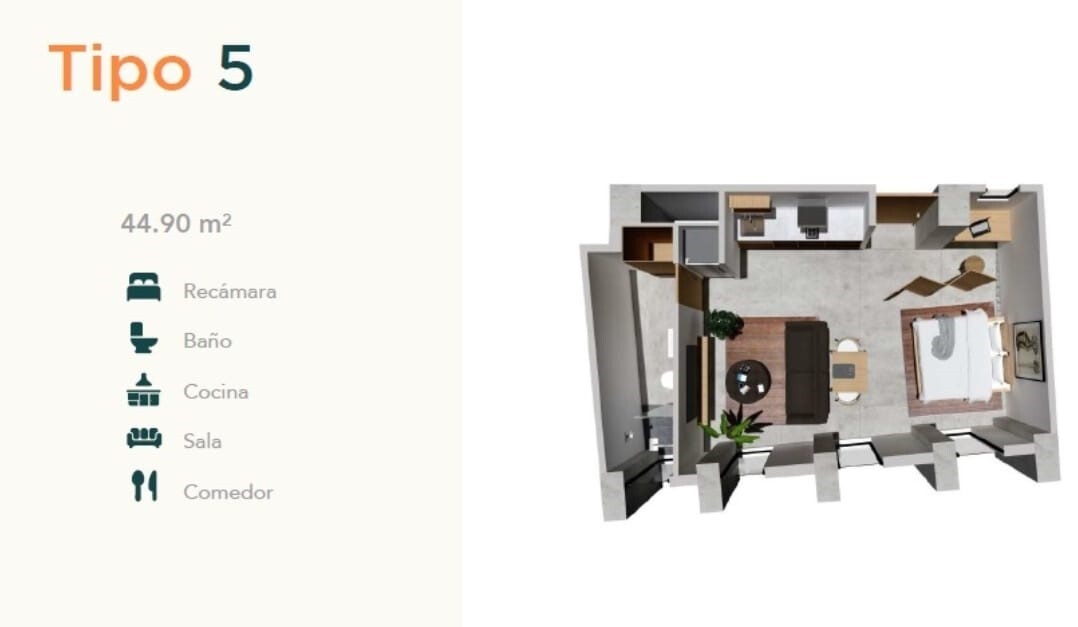 Todos los deptos cuentan 1 recamara, area sala comedor, cocina, baño, completo, algunos de los modelos cuentan con terraza .
