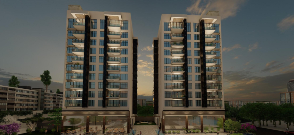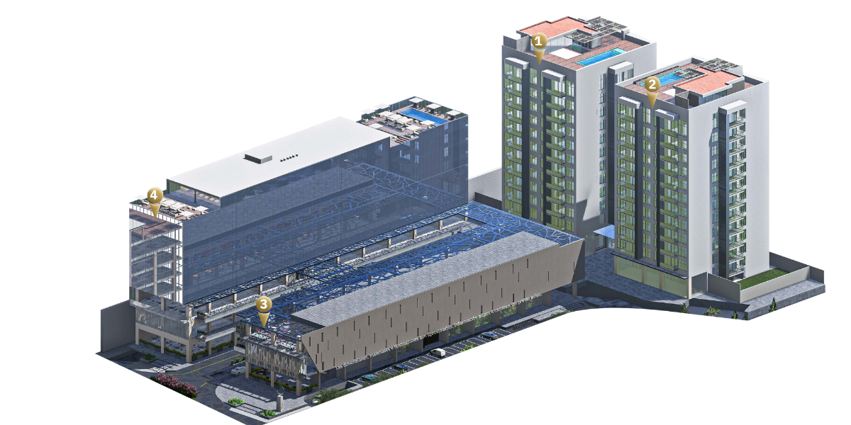 Área habitacional con dos torres de departamentos y área comercial acompañada de un hotel de cadena internacional.