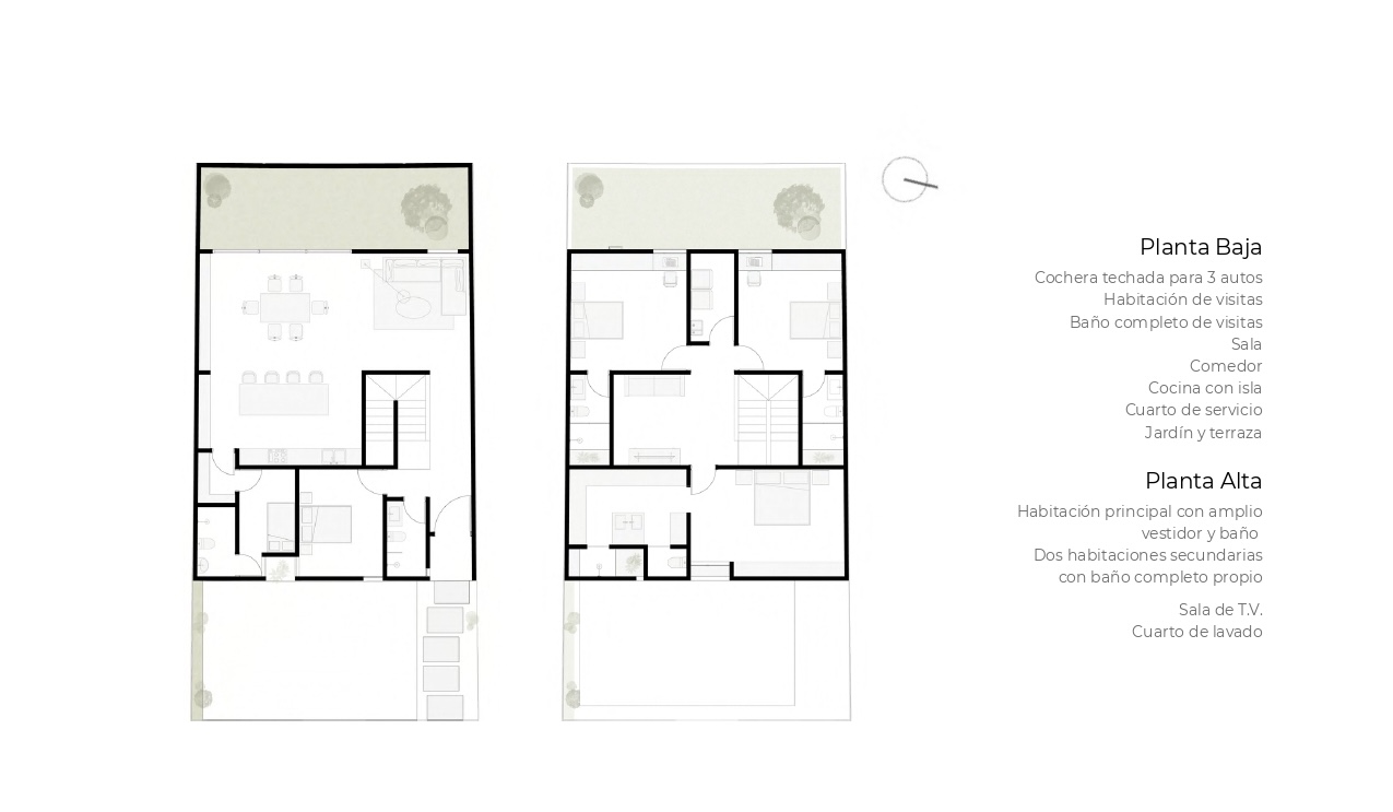 Planta Alta: Habitación principal con amplio vestidor y baño, Dos habitaciones secundarias con baño completo propio y closet, Sala de T.V., Cuarto de lavado