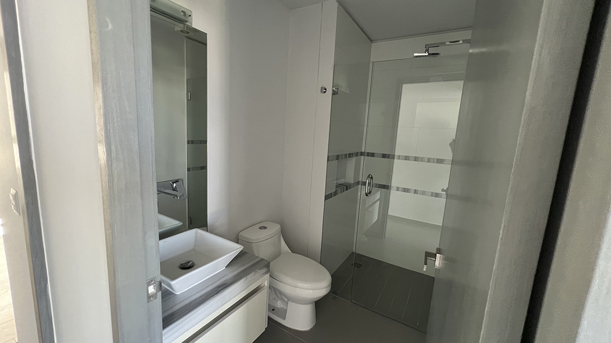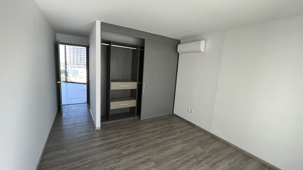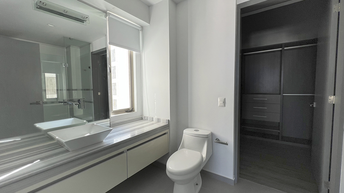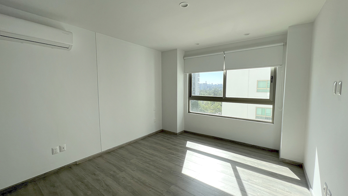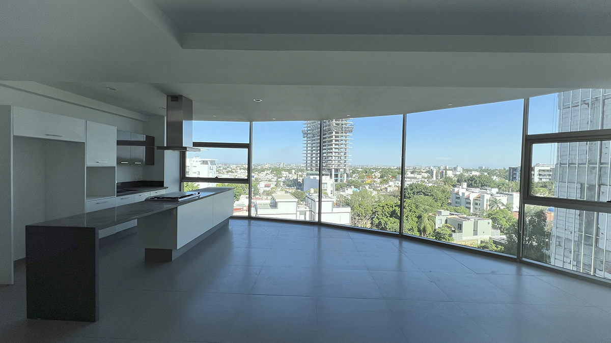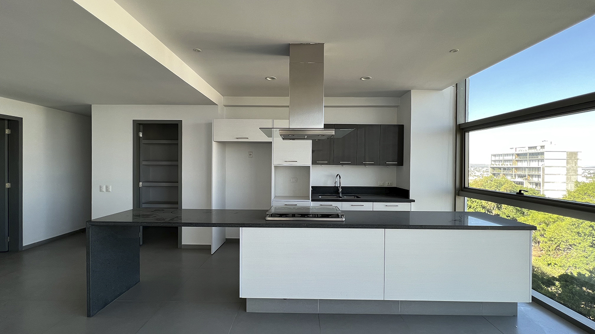 Departamento de lujo en el piso nueve con vista panorámica y seguridad de acceso controlado. Tres habitaciones, cada una con baño completo y aire acondicionado, destacando la habitación principal con amplio vestidor. la estancia se completa con un área de sala y un espacio para comedor, ambos con aire acondicionado y persianas. la cocina integral está equipada con estufa, campana y barra desayunador. Además, cuenta con área de servicio con baño completo, tanque de gas estacionario y dos cajones de estacionamiento.