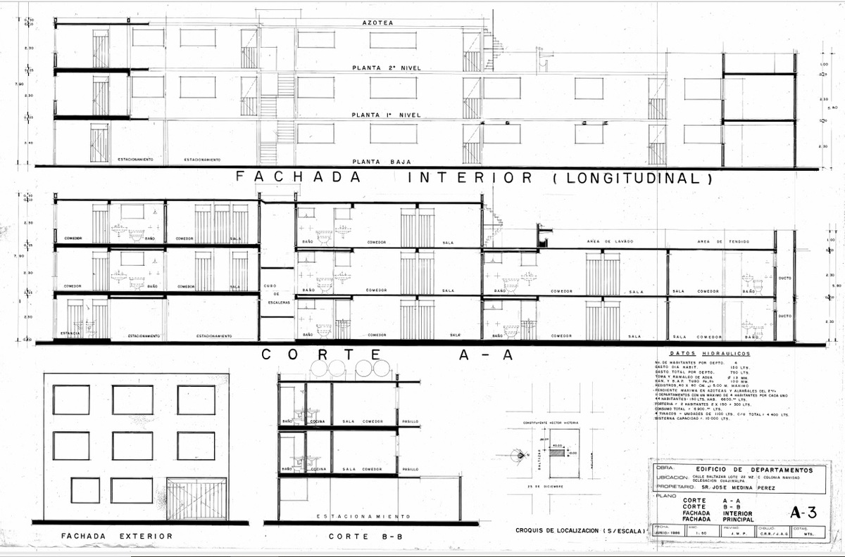 PB: 1 departamento exterior y 3 departamentos interiores, con área de lavado cada uno, bodega común y estacionamiento hasta para 9 automóviles.