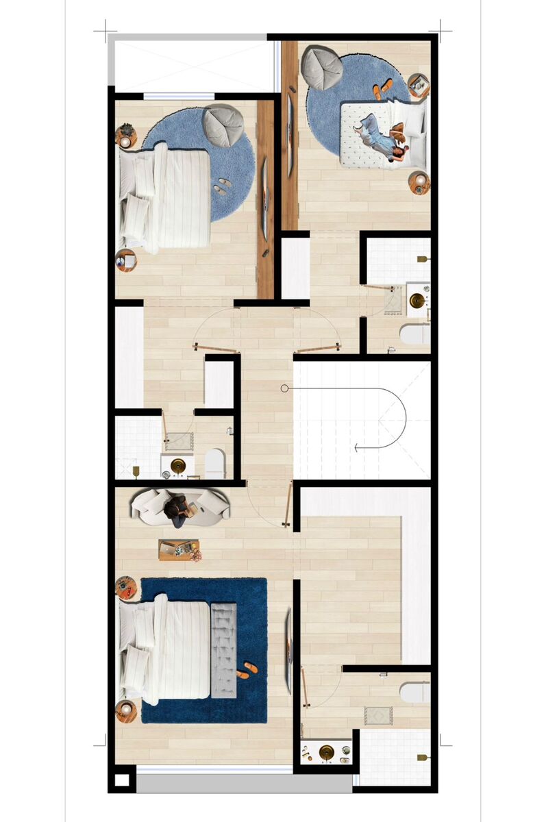 2 recámaras secundarias, cada una con baño completo y espacio para clósets