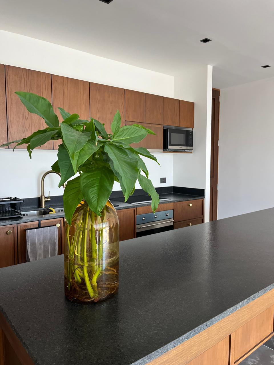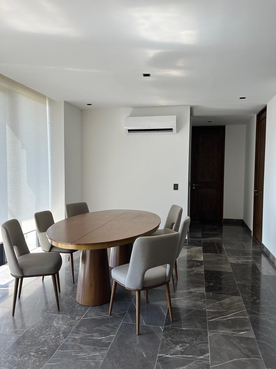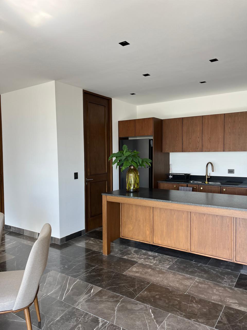 Amplia e iluminada área de sala y comedor con terraza y vista espectacular, cocina abierta con barra en acabados de fino granito y carpintería de excelente calidad.