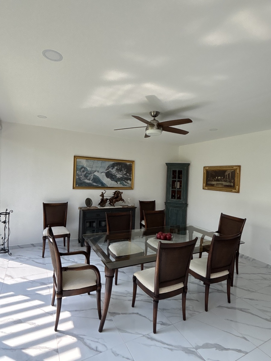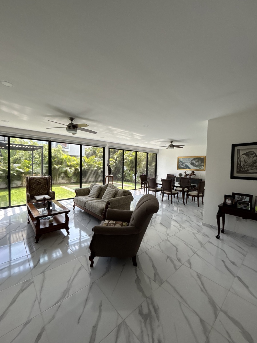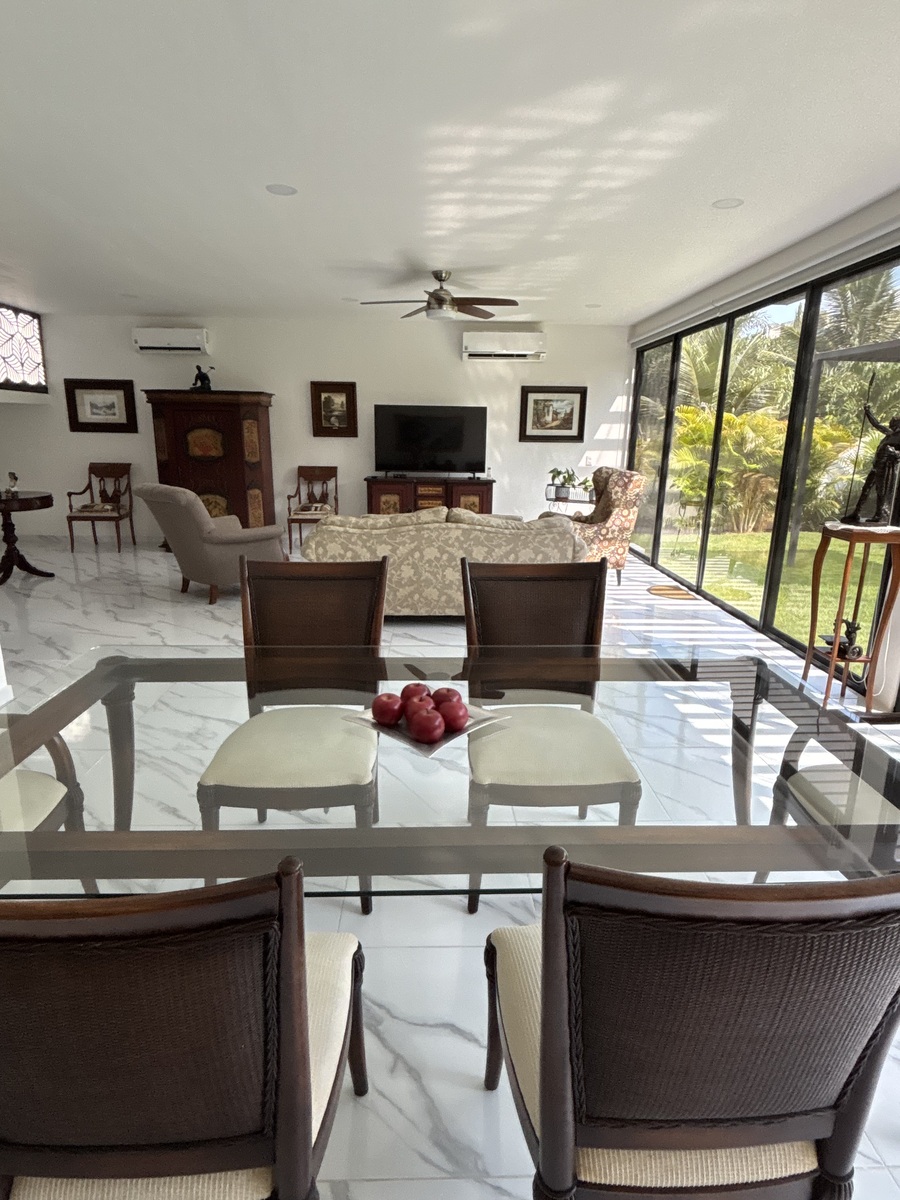 Sala y comedor con bonita vista al jardín y a la piscina.