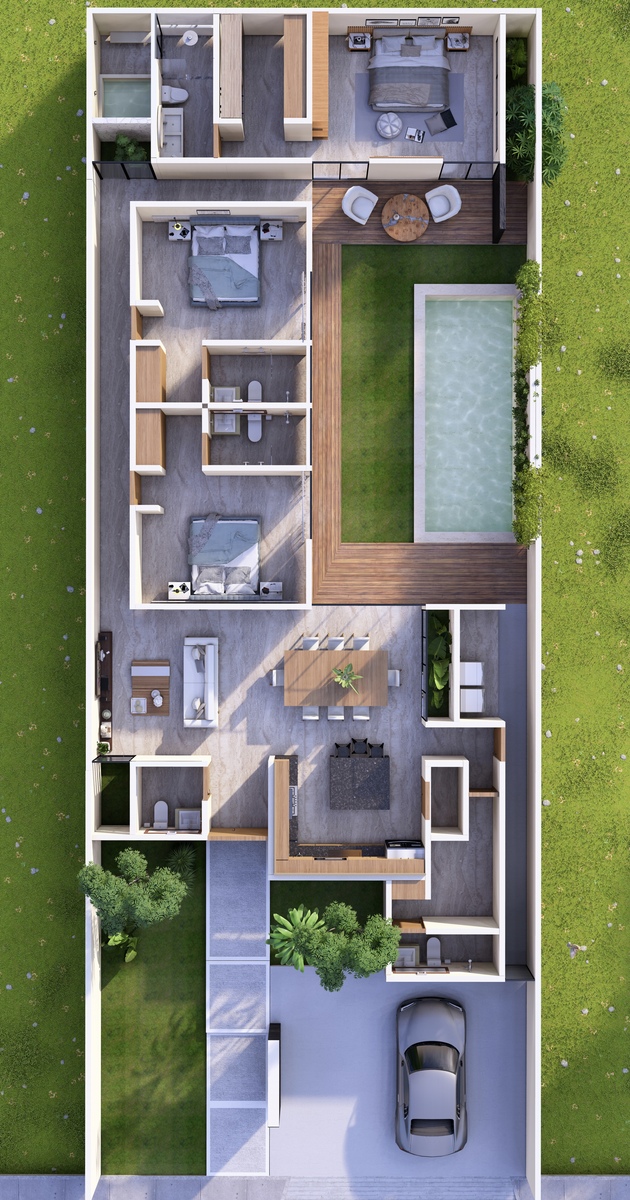 - 3 recámaras, cada una con baño y vestidor, baño principal con jacuzzi de hidromasaje para dos personas