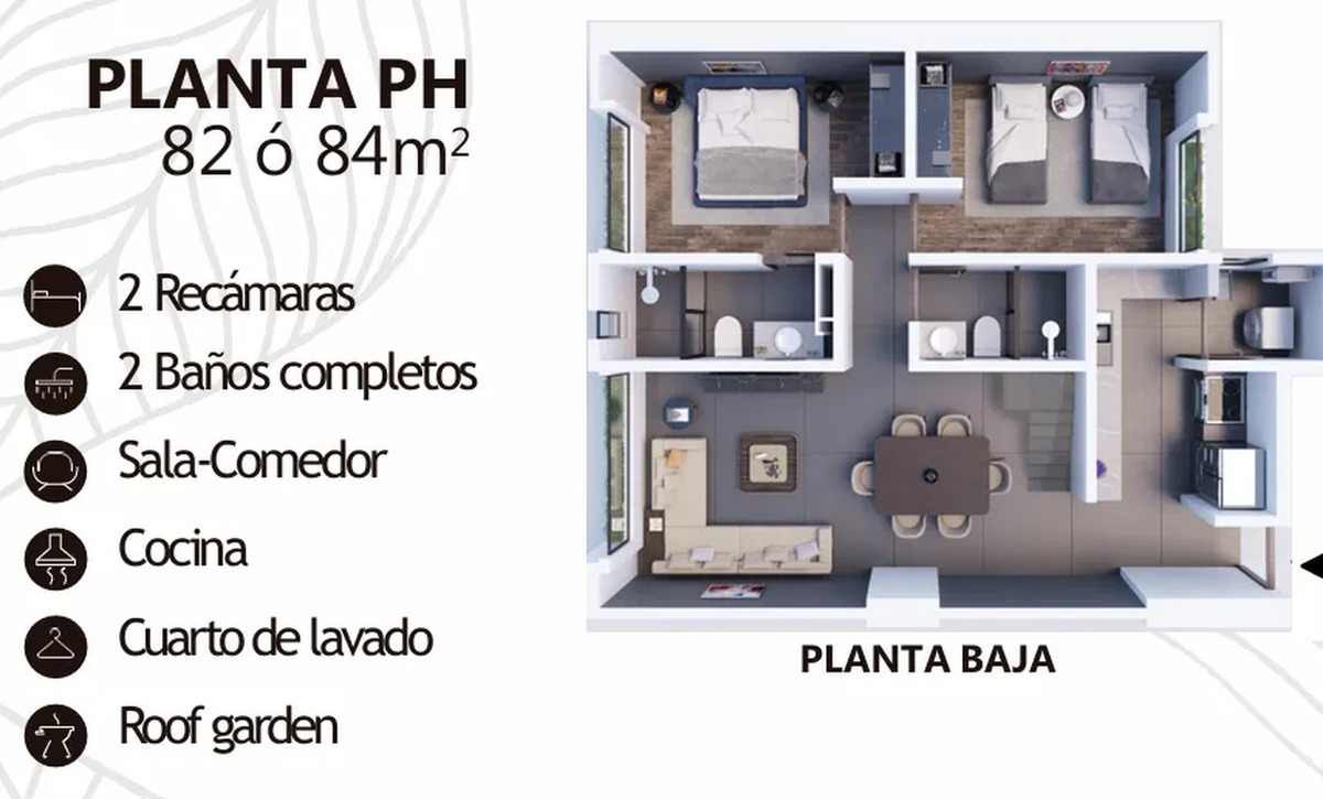 El depto anunciado es el PH 7. Cuenta con 82m2 habitables, 2 recámaras 50 m2 de roof garden privado y 2 lugares de estacionamiento FIJOS.