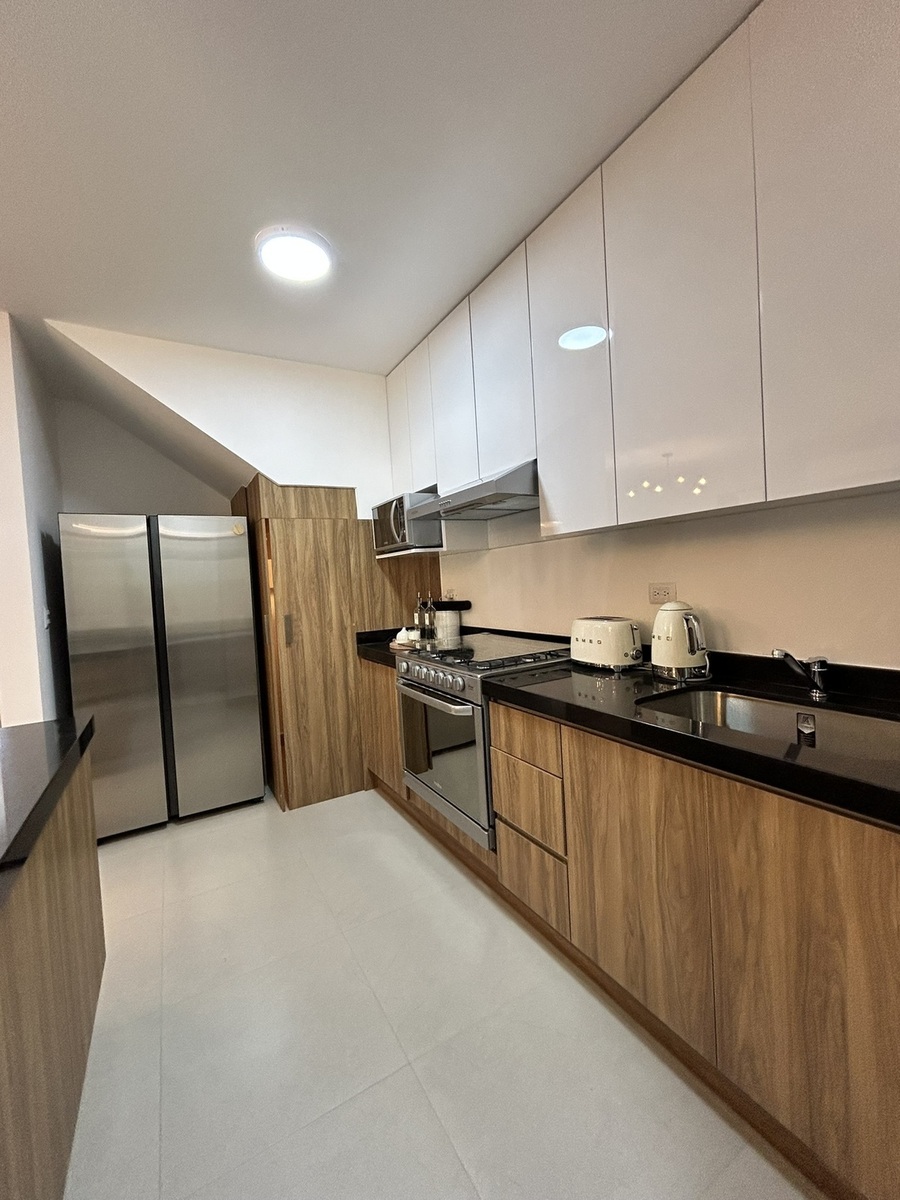 cocina equipada con barra de granito y alacenas en alto brillo blanco