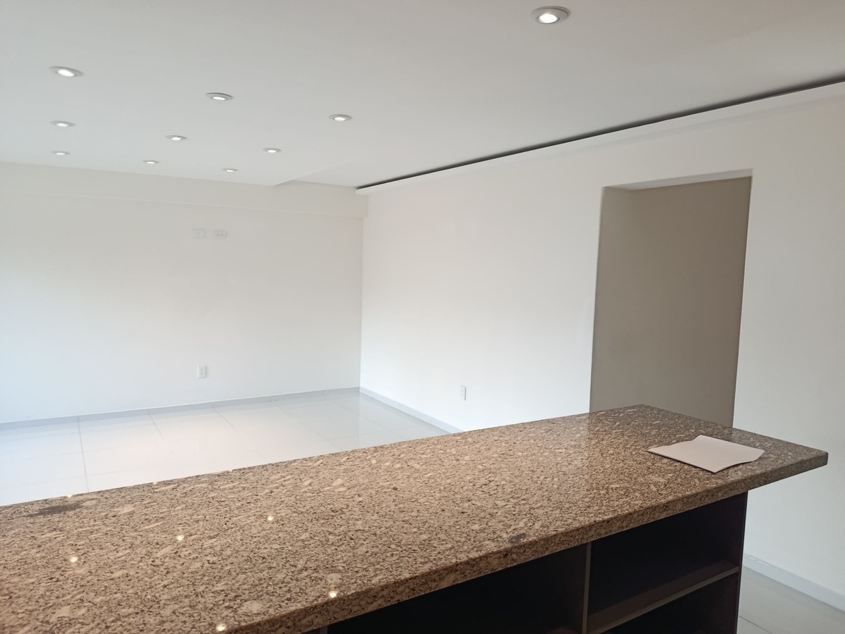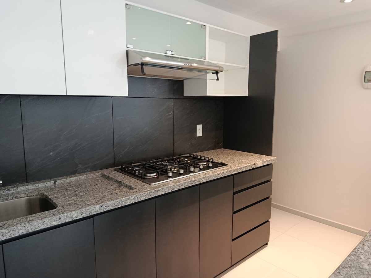 El departamento cuenta con dos recámaras con closets de madera, la principal con baño completo y hay otro baño completo para compartir. Sala comedor con balcón, cocina abierta con cubierta de granito, area de lavado y un lugar de estacionamiento.