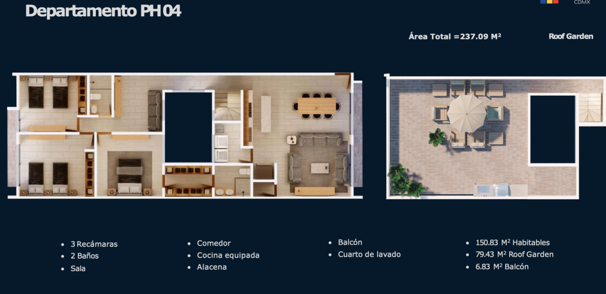 Superficie: 150.83 m2 habitables + 6.83 m2 de balcon y 79.43 m2 de roof privado