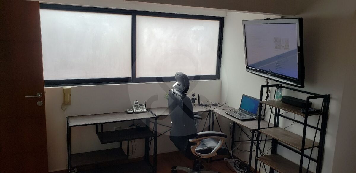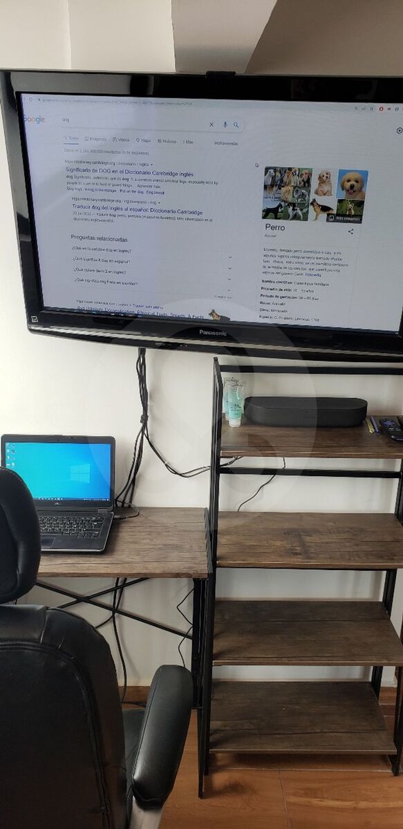 Espacio de trabajo con escritorio, TV y bocina