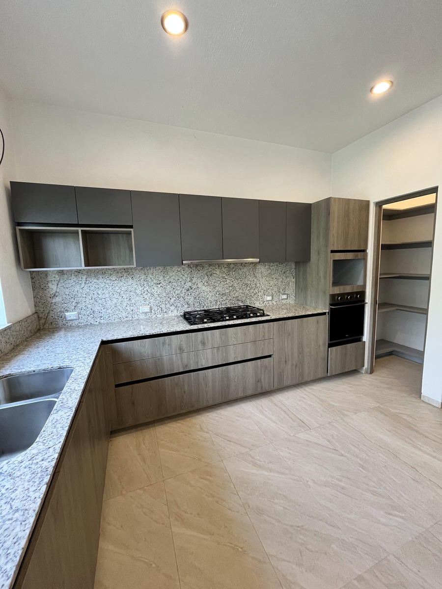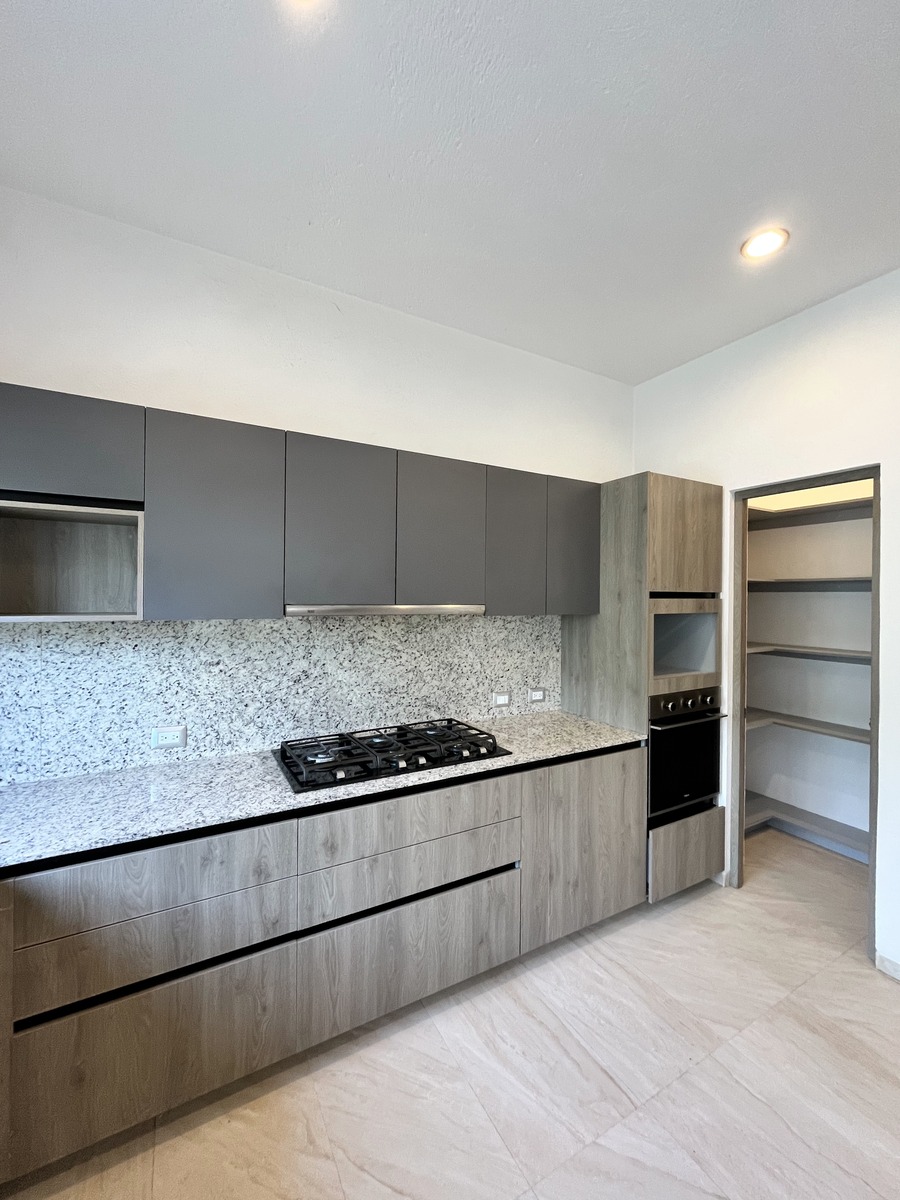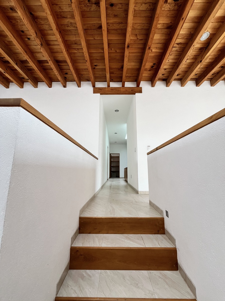 Acabados en madera, pisos porcelánicos de gran formato, recubrimientos de cantera en fachada, baños con cubiertas de granito y canceles de cristal templado.