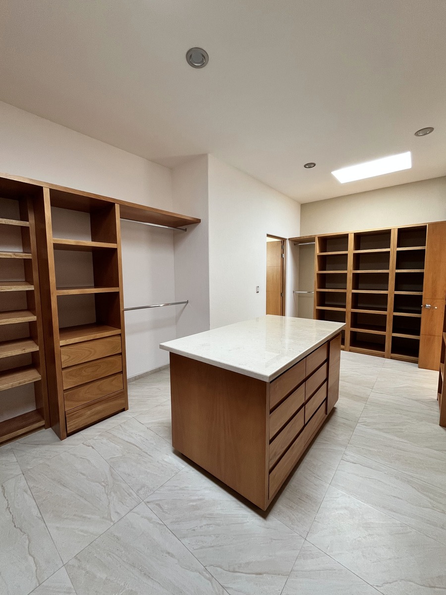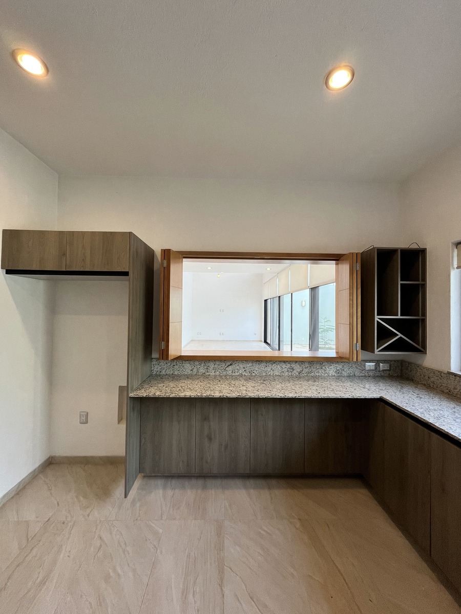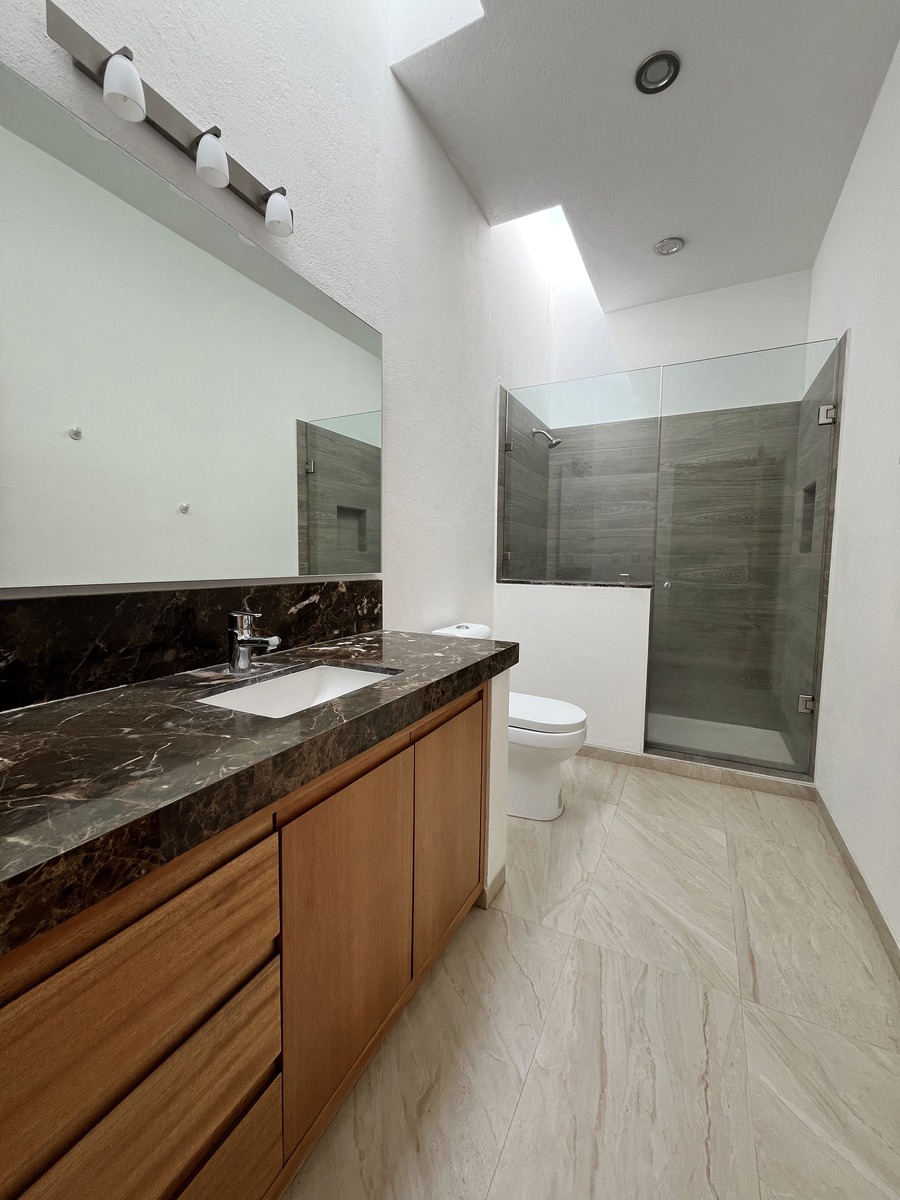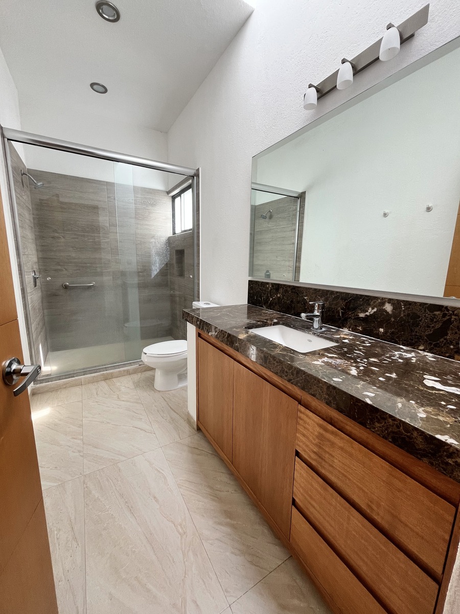 Acabados en madera, pisos porcelánicos de gran formato, recubrimientos de cantera en fachada, baños con cubiertas de granito y canceles de cristal templado.