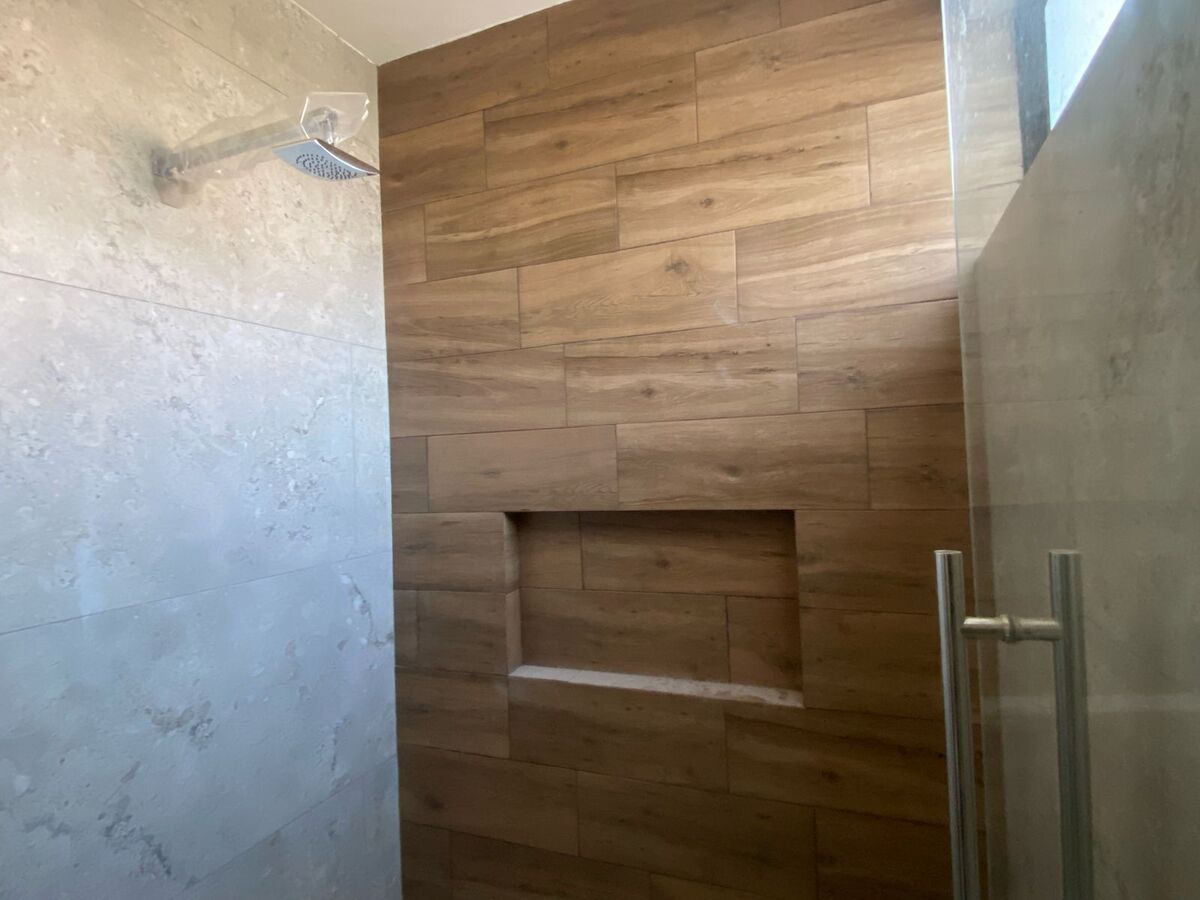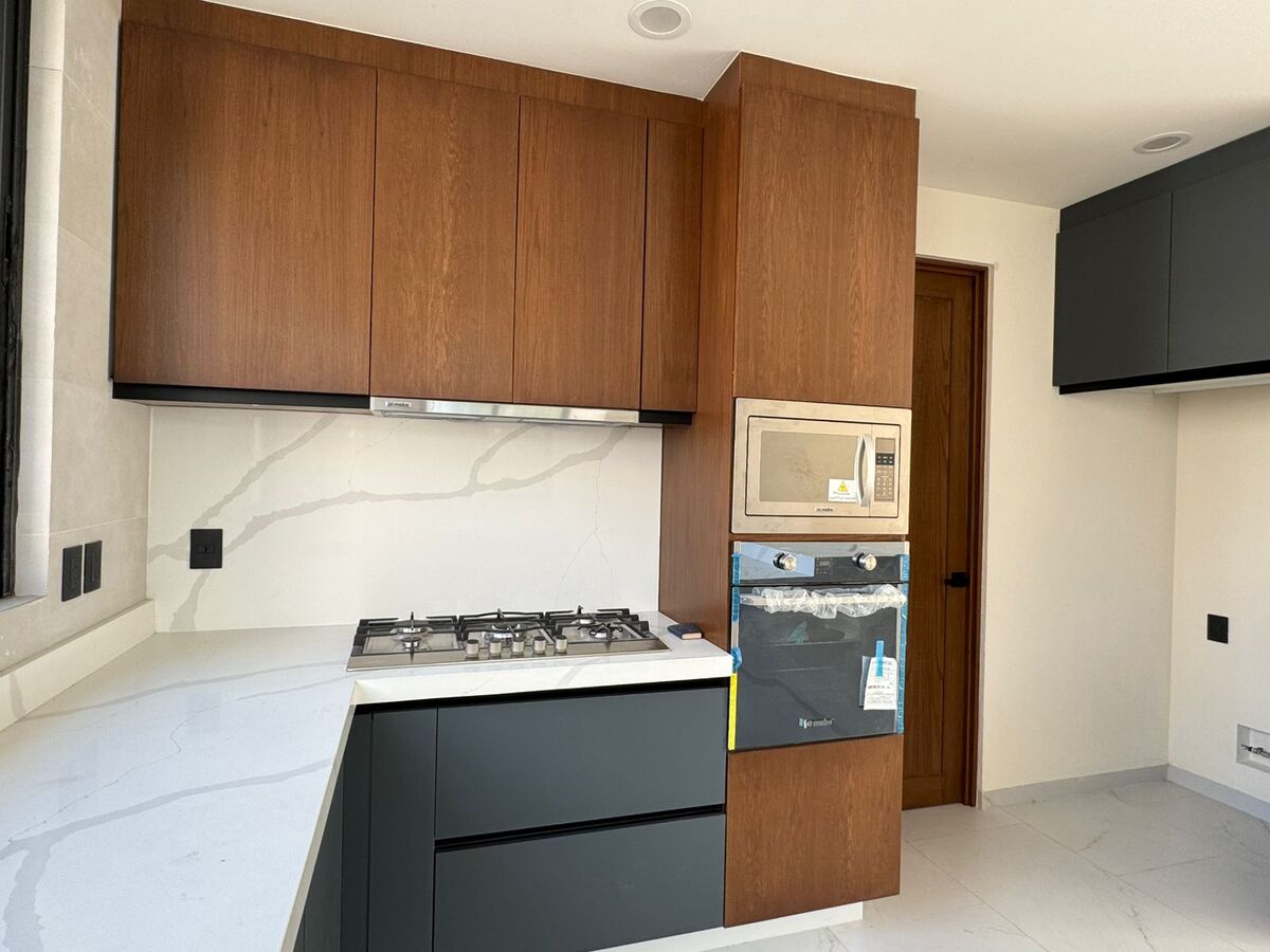 madera, comedor que conecta de manera fluida con el resto de la estancia, un bar ideal para el entretenimiento, cocina integral con barra de granito y una puerta corrediza que permite aislarla de la sala.