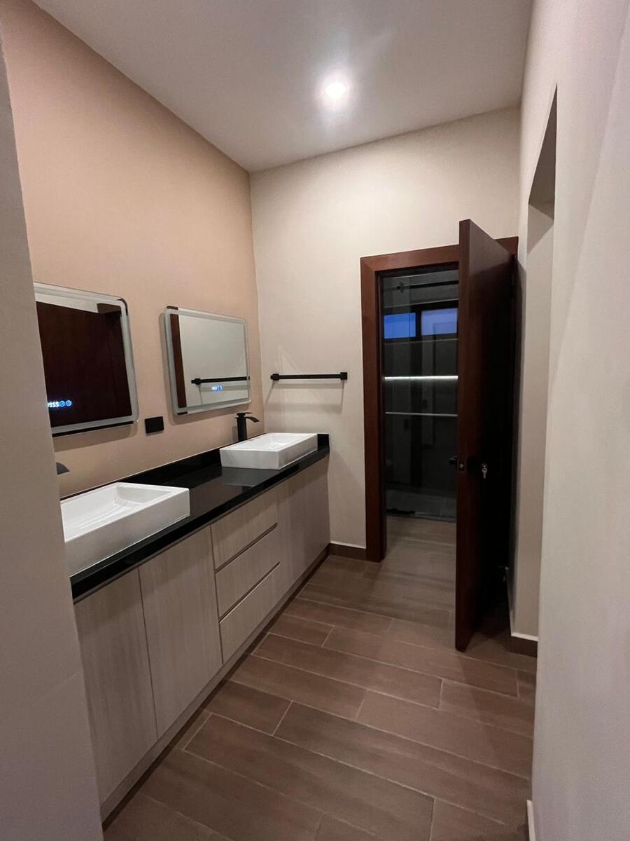 Equipo: Tinaco y cisterna para almacenar 9,200 litros de agua,, bomba hidroneumática, cocina de melamina con cuarzo, horno, parrilla, campana, candiles y lámparas, lambrin en muros, baños inteligentes, construcción térmica.